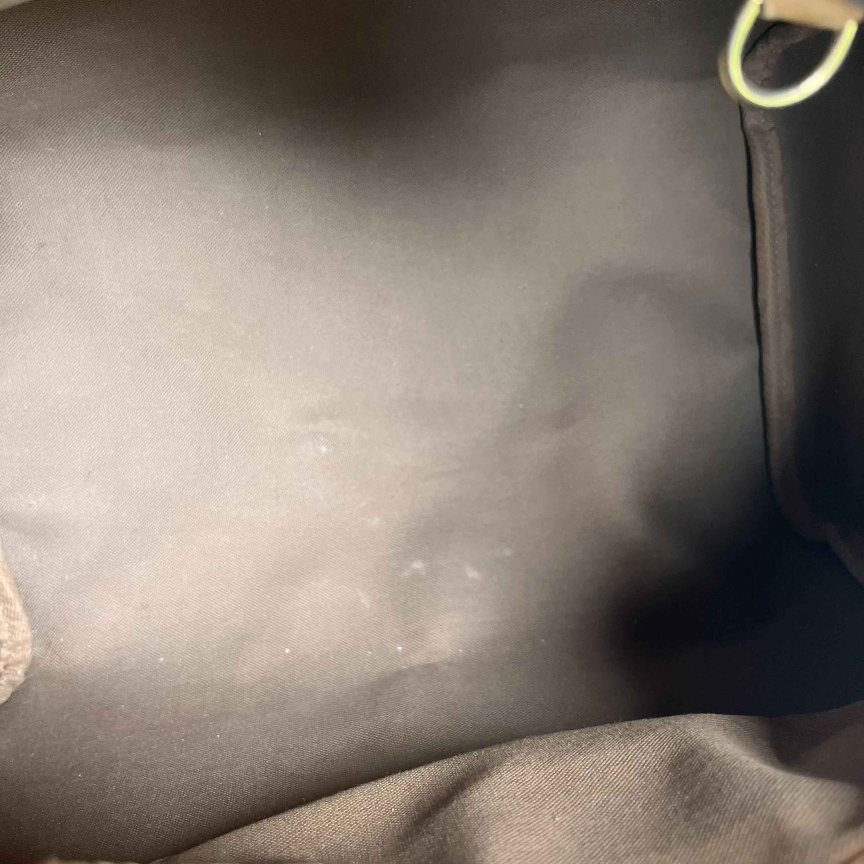 ·Handle + Vachetta: The vachetta leather has patianed displaying wear such as: water spots, scuffing, soiling, rubbing, markings, creasing, scratches while appearing darker in certain areas(please refer to photos).