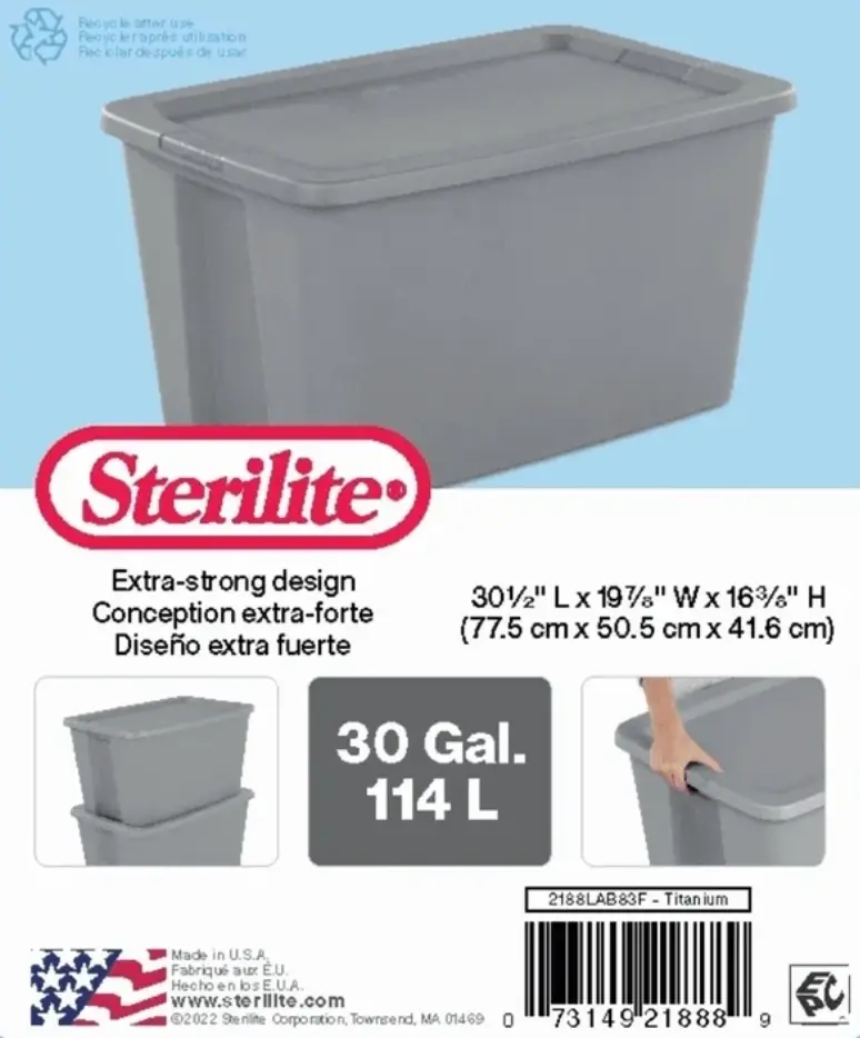 Stay organized with Sterilite’s 30 Gallon Storage Bin with Lid! The square, space-efficient shape features a deep recessed lid which allows totes to stack securely, maximizing vertical storage space. The broad rim adds strength and the textured integrated handles make for easier carrying and lifting. Contain and conceal clutter throughout your home to create a neat and tidy living space! This large sized plastic storage container is ideal for sorting and storing bedding, sporting gear, bulky items, and more. Note: Use good judgment when storing items, don’t overload, keep heaviest bin at bottom, and don’t stack too high.