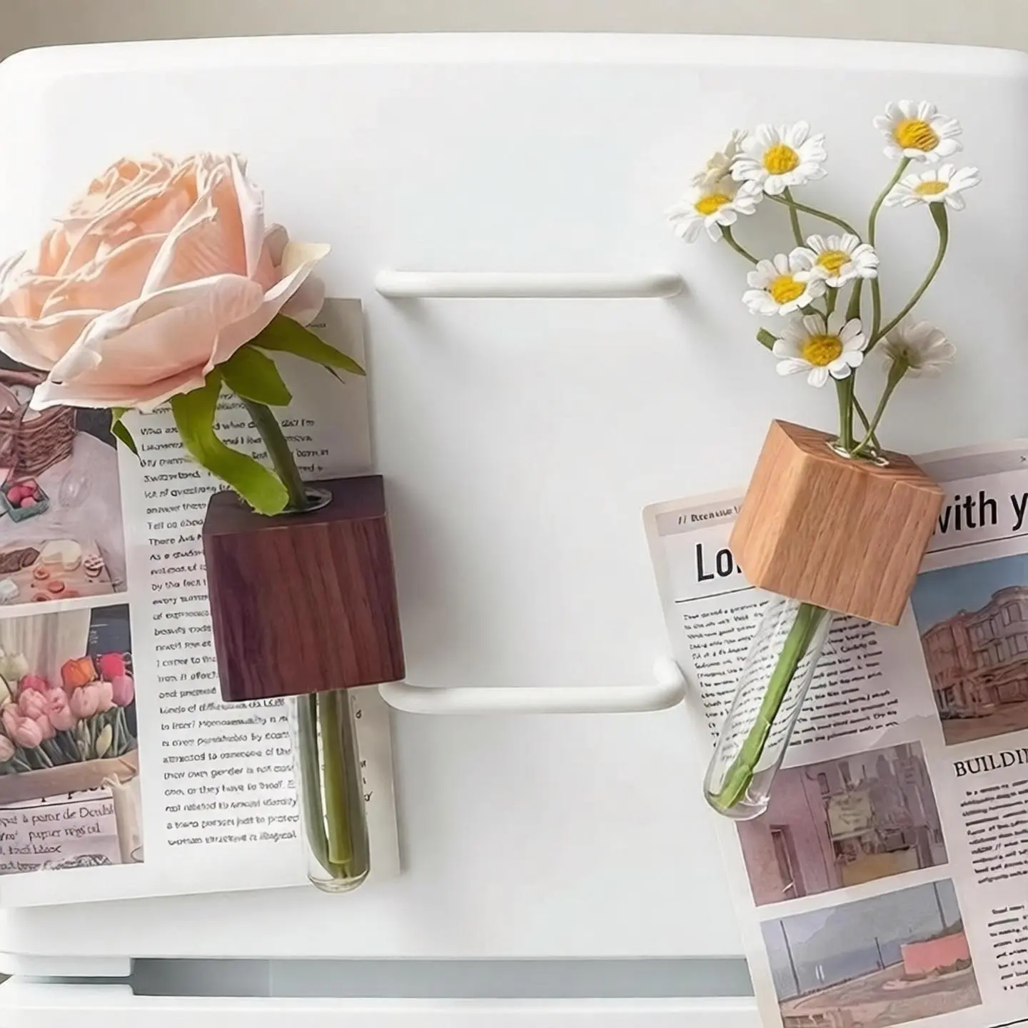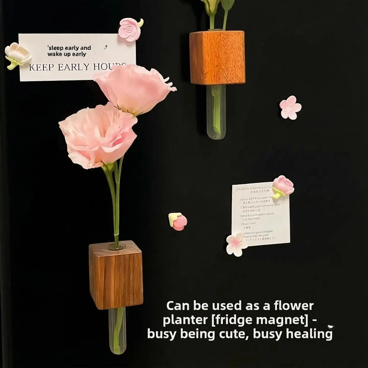Compact, minimalist, and easy to maintain, this multi-functional decor piece is suitable for small spaces, dorm rooms, or as a thoughtful gift for plant lovers and home decor enthusiasts. It combines the beauty of natural wood, the simplicity of test tube flower arrangements, and the convenience of a magnetic (message board), making it a unique addition to your home that balances aesthetics and utility. Refresh your space effortlessly with this creative wooden test tube fridge magnet vase!