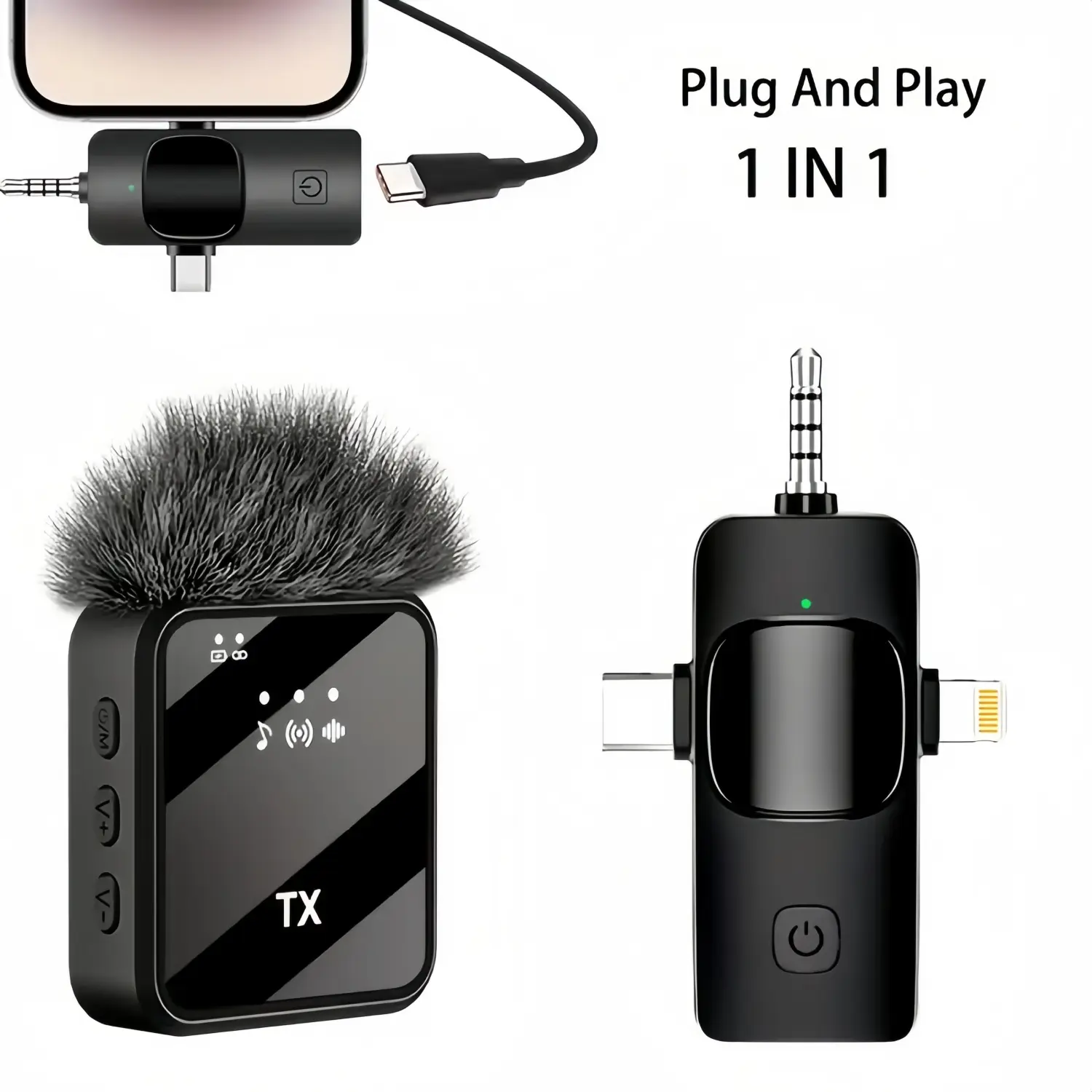 Full Compatibility - 3 in 1 Universal Receiver: Eliminates the need for multiple interfaces or cables. - Device Compatibility: Compatible with Android smartphones, iPhone (including iPhone 15), iPad, laptops, personal computers, and cameras. - Versatile Use: Ideal for blogging, interviewing, live streaming, podcasting, YouTube, Instagram, and TikTok.