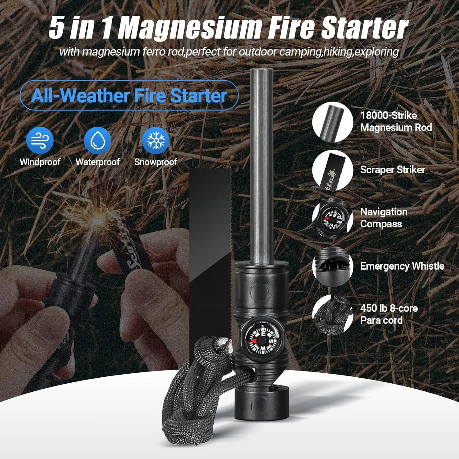 Five-in-one multifunctional magnesium fire starter: Equipped with a 18,000-stroke magnesium rod, scraper, navigation compass, emergency whistle, and 450-pound 8-core paracord;windproof, waterproof, snowproof, suitable for any weather;ideal for outdoor camping, hiking, exploration, and emergency survival