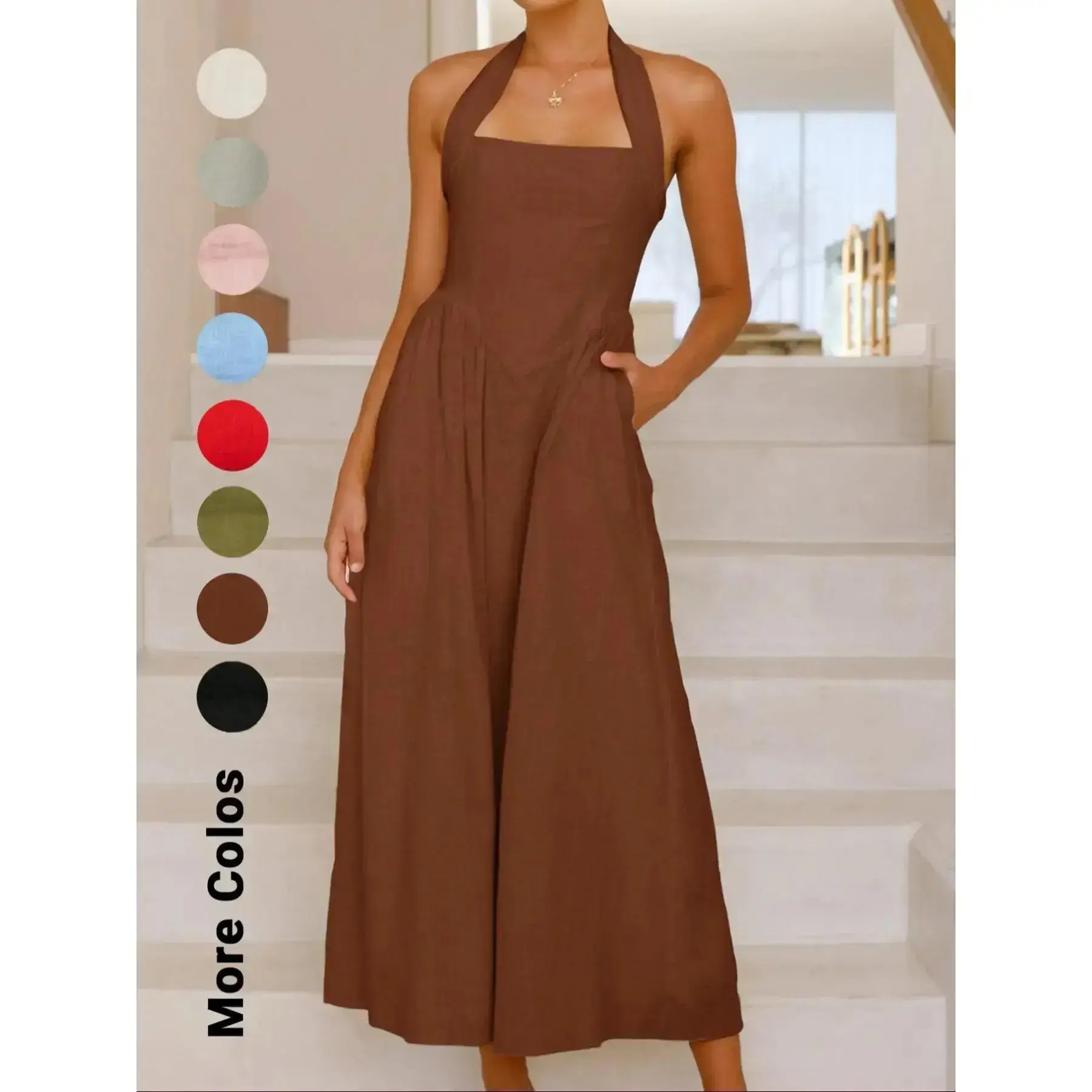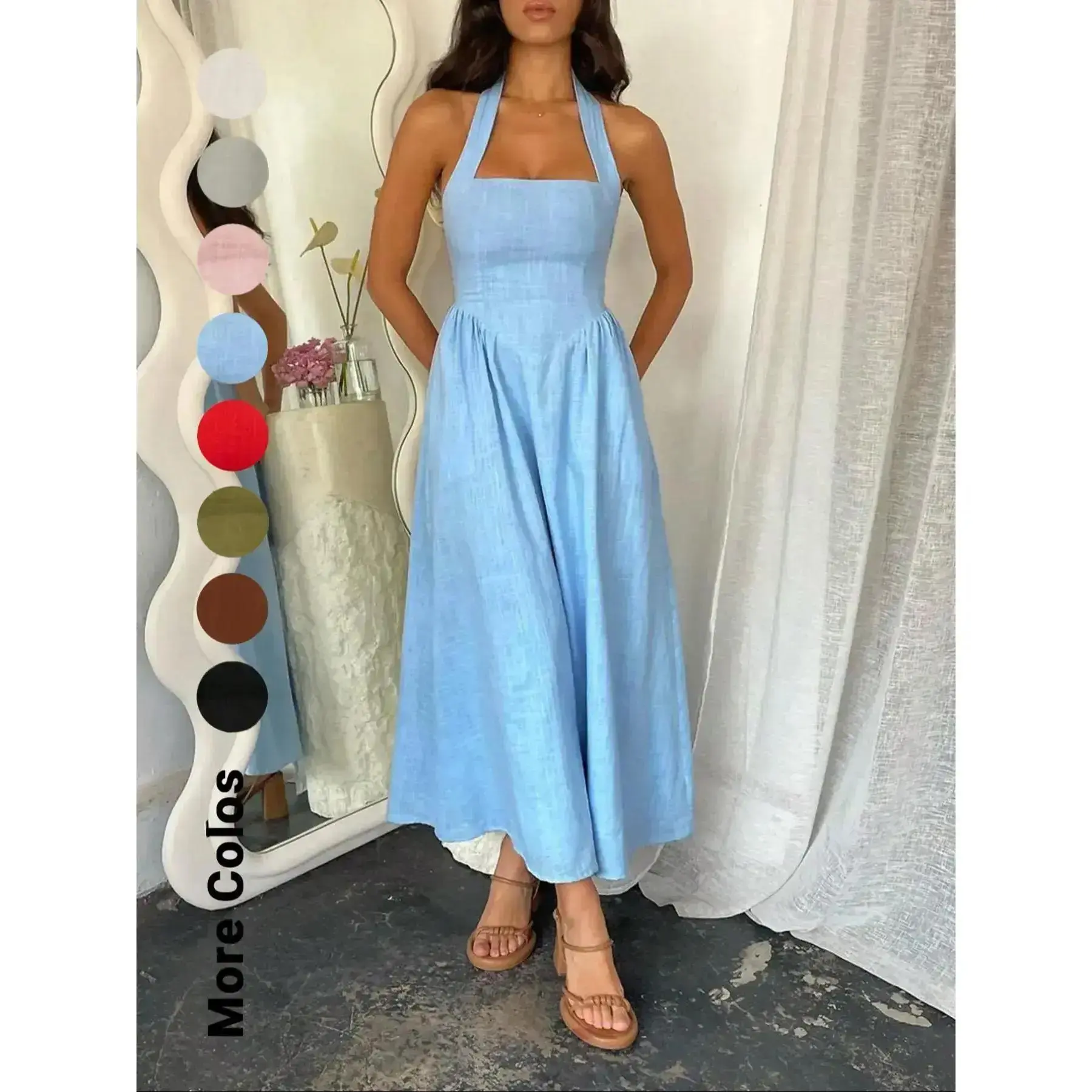 This women's midi dress is designed to create a stylish, put-together look with comfortable movement throughout the day. With halter neck and sleeveless, it feels easy to wear while still looking polished and flattering. Style it with sandals, heels, or simple accessories for vacation, brunch, shopping, weekend outings, and everyday wear.