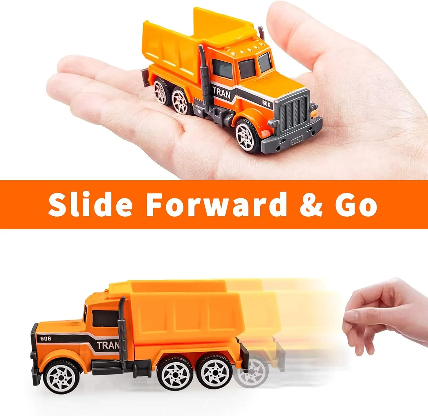 Fun Kids toys sets: There are 6 types of construction trucks for children to choose from and each alloy car is in unique design. Our mini car perfect fit in kid's hands and pockets and also easy to carry. With just a small amount of sand or grass, your child can build their own engineering base anywhere