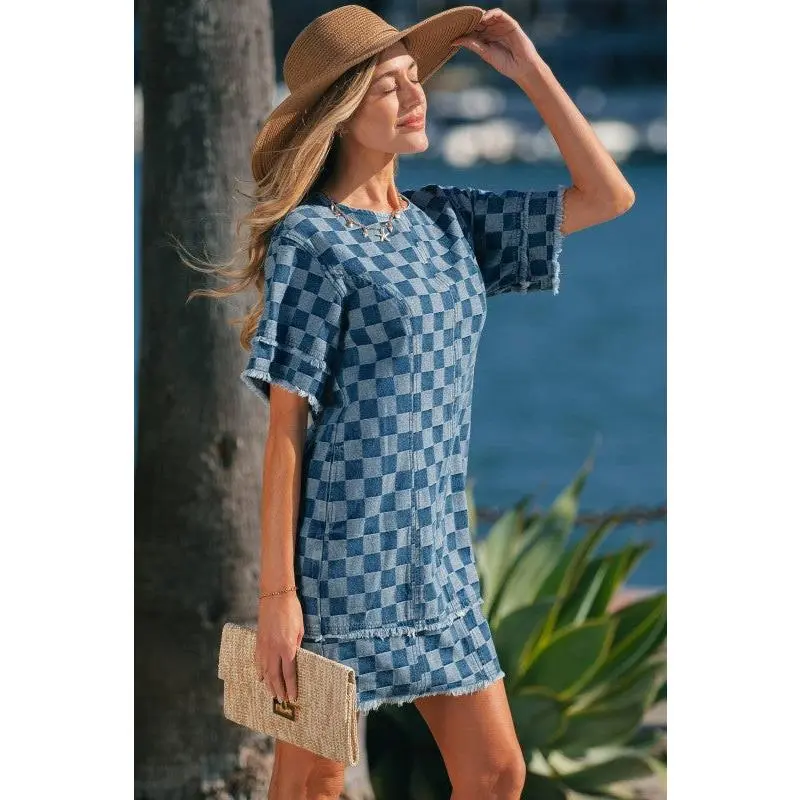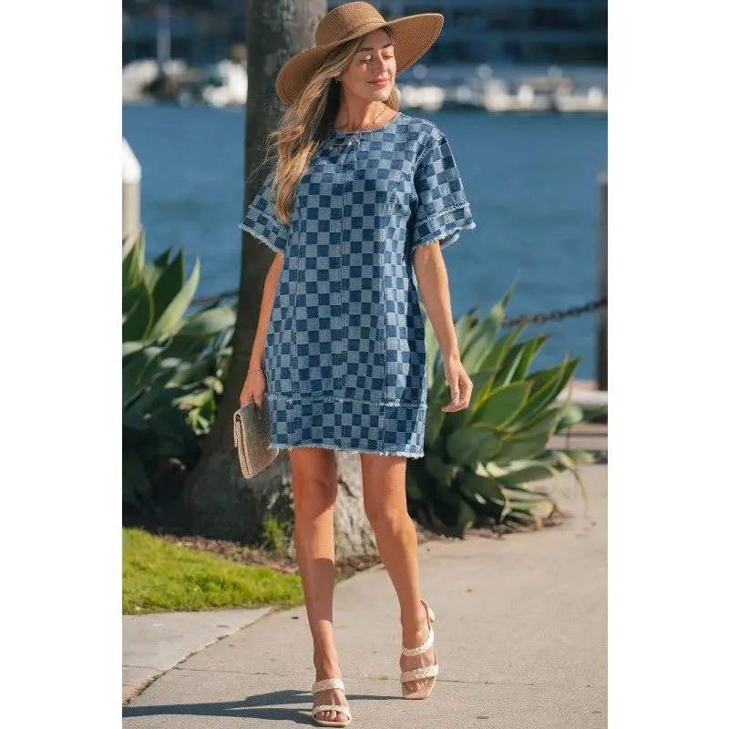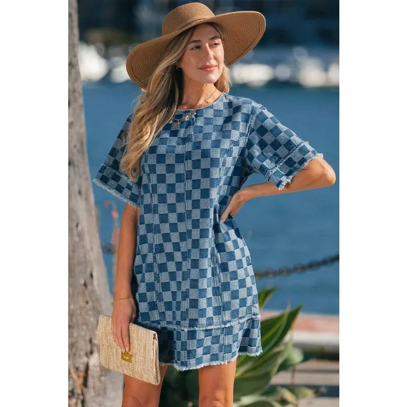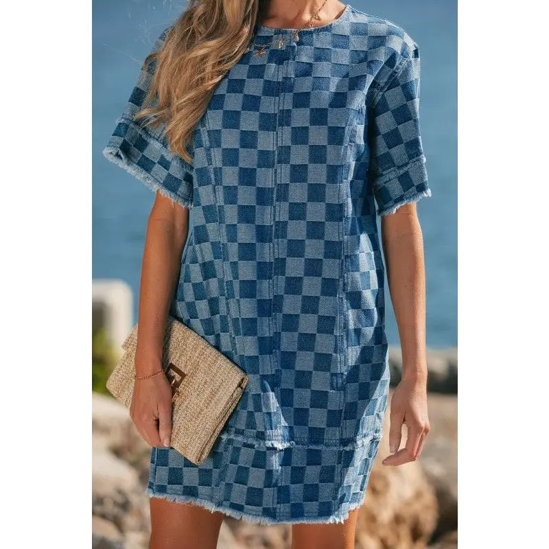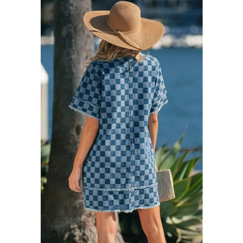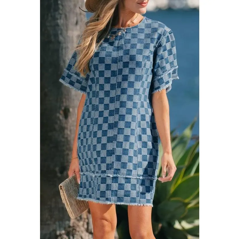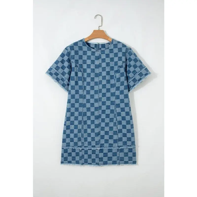 Jessie Hem Checkered Mini Dress is the piece you'll reach for when you want to look put together in seconds. This denim dress is classic and fashionable with checkered pattern. The frayed trim adds a fashion-forward edge. The stitched patchwork adds extra chic modern detail to this chambray dress. The shift fit style is flattering for most body shapes.