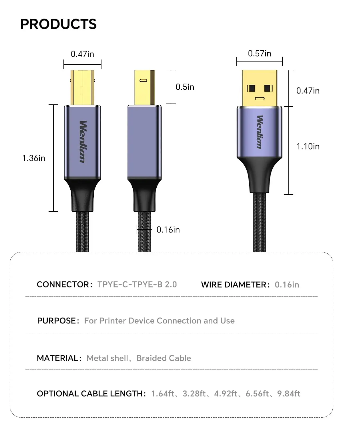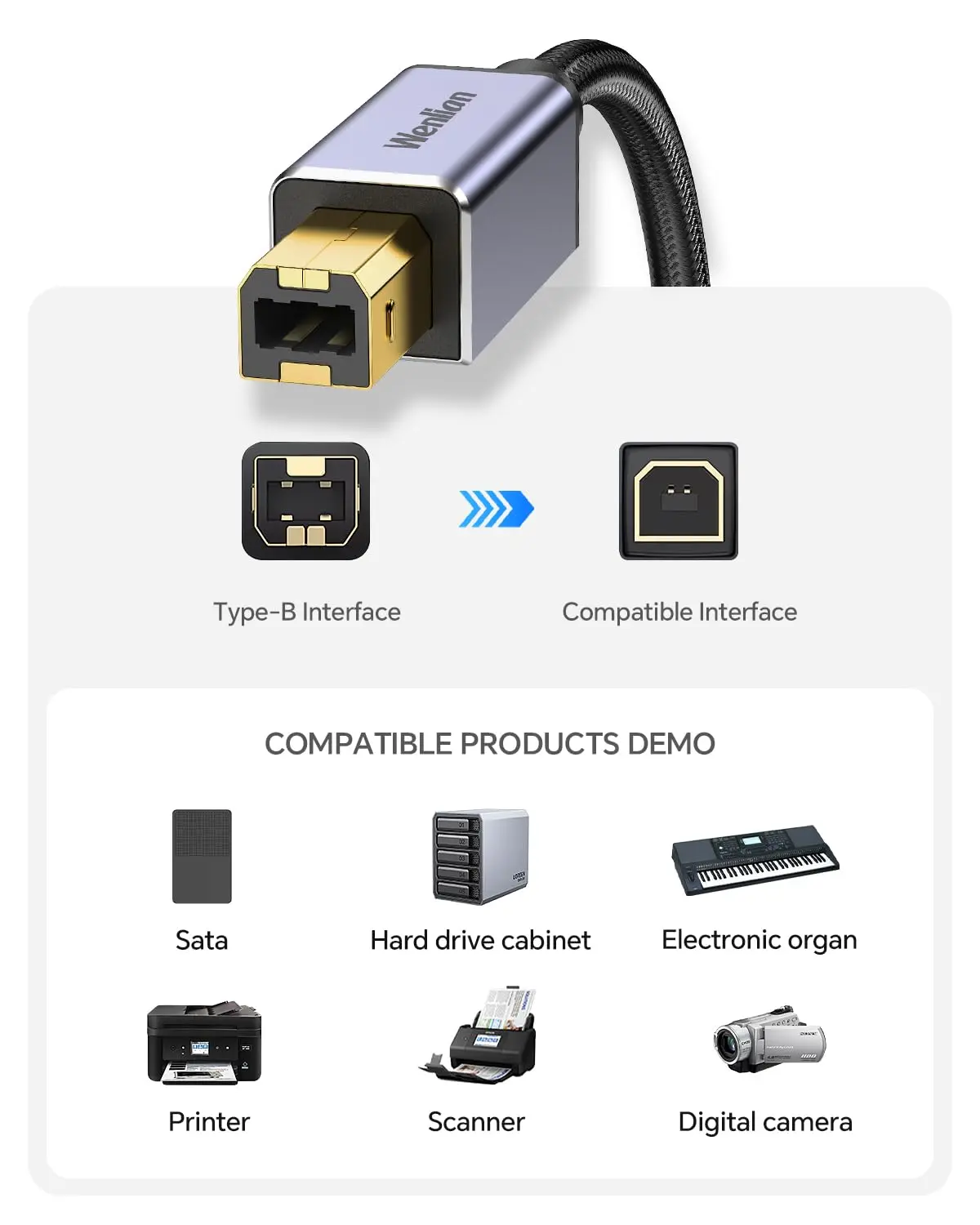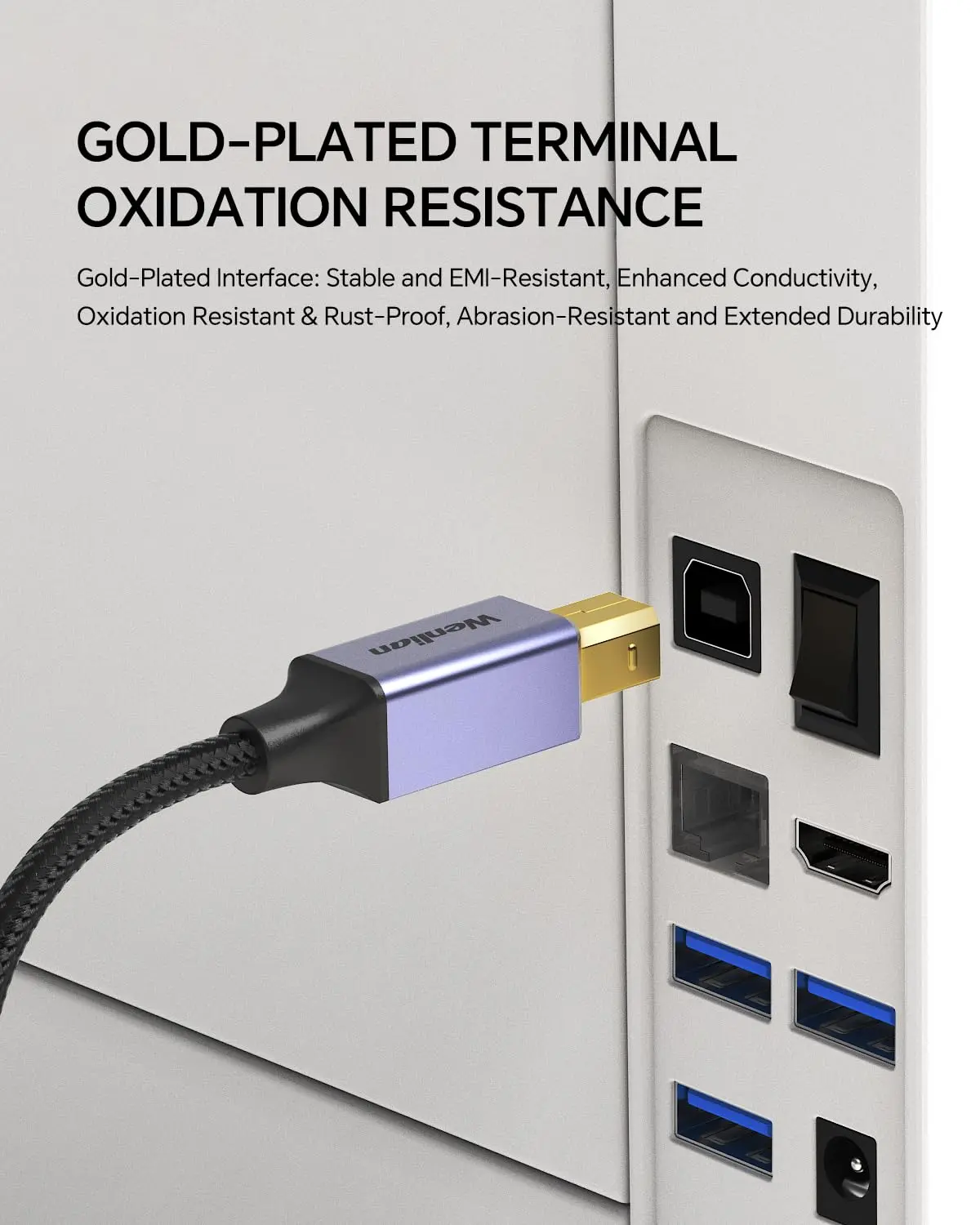 ·Designed for reliable everyday connections, this USB 2.0 A to B printer cable supports stable data transfer up to 480Mbps, helping ensure smooth communication between your computer and USB Type-B devices. Built with a tinned copper core, dual-layer shielding, and an integrated EMI ferrite core, the cable helps reduce signal interference for consistent printing and data transmission. The gold-plated connectors are designed to help resist oxidation and maintain stable contact during repeated use. A durable nylon braided jacket improves flexibility and durability for daily office, home, or studio environments. Compatible with most USB Type-B 2.0 devices, including printers, scanners, MIDI controllers, DACs, and digital pianos from brands such as HP, Canon, Epson, and Brother. Available in 3.3ft, 6.6ft, and 10ft lengths to suit different workspace setups.