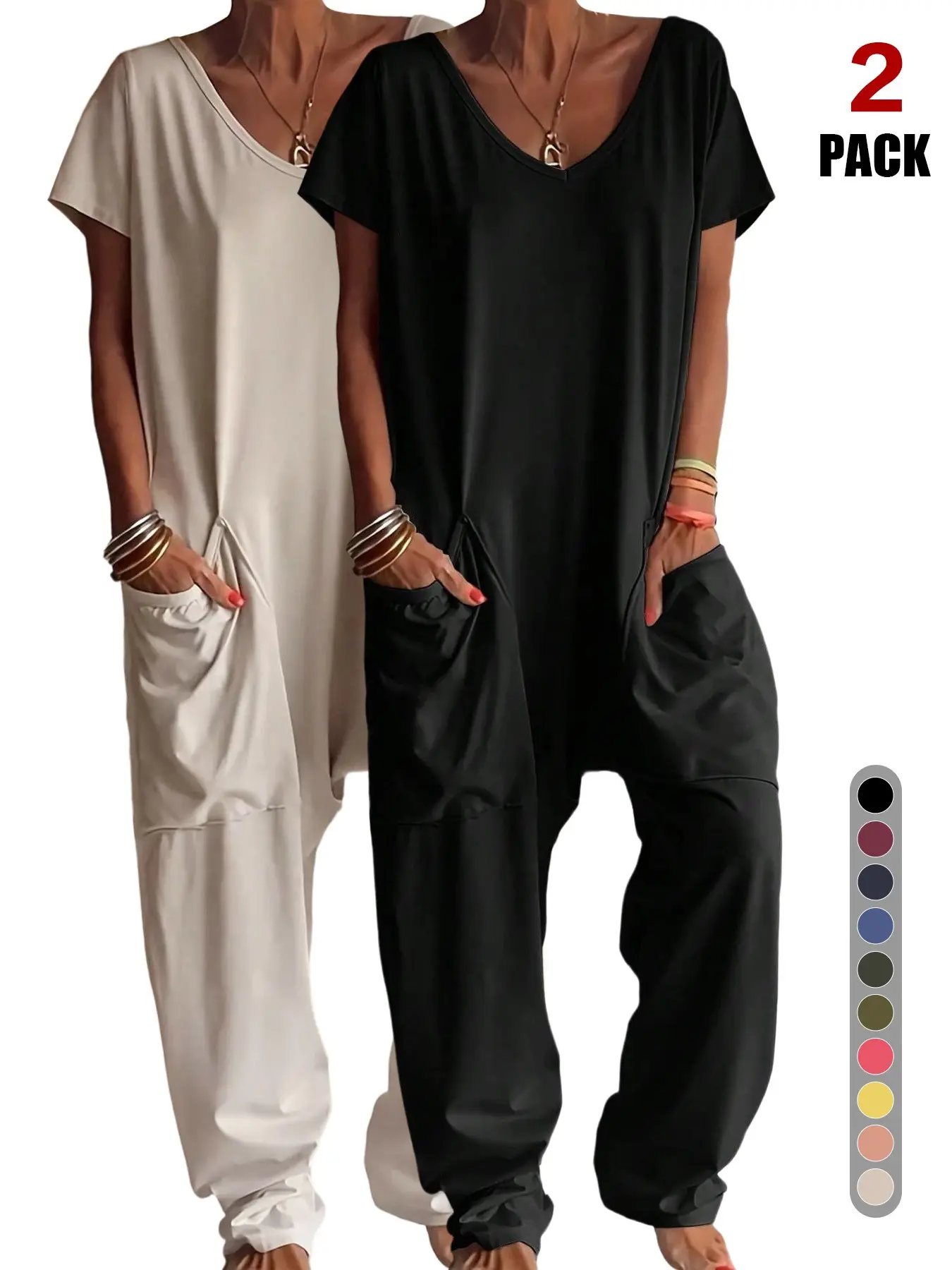 Women's Fashion Oversized Harem Jumpsuit, Bohemian Style One Piece Romper, Short Sleeve Fitted Casual Suit, All Seasons Plain Pattern