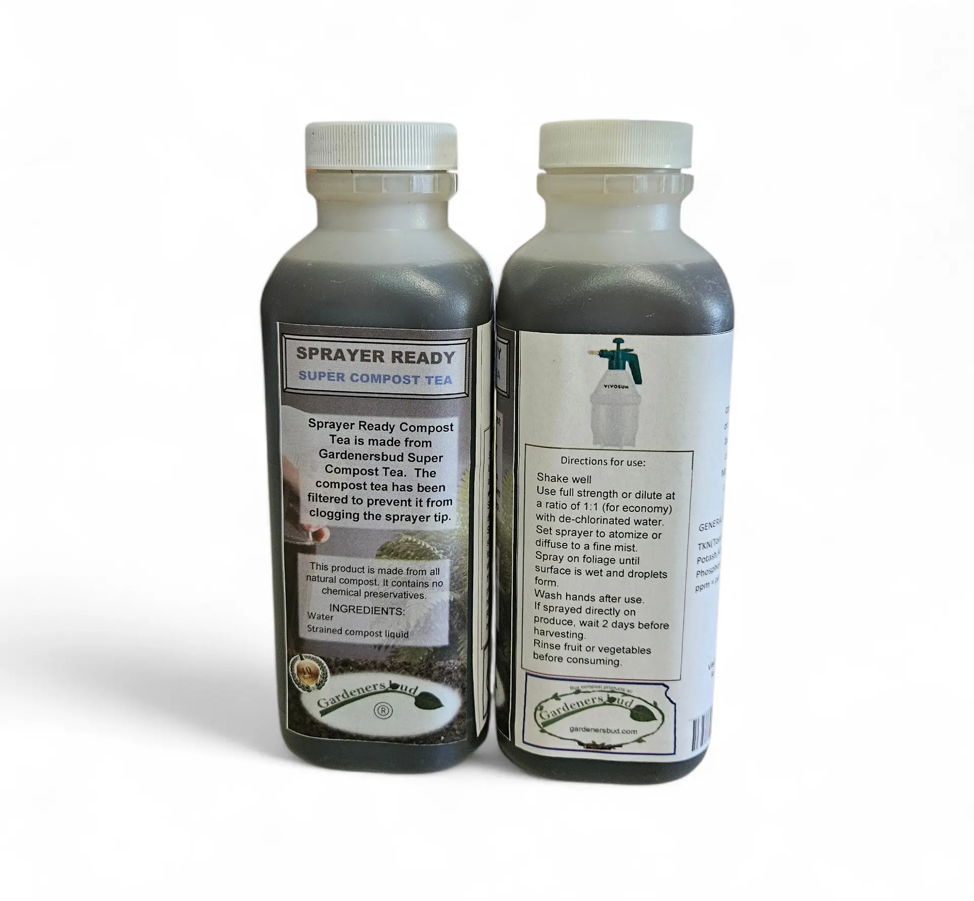 Sprayer Ready Compost Tea is made from our Super Compost Tea. It has been filtered to remove solids so that is does not clog the sprayer tip. Sprayer Ready Compost Tea is a foliage sprayer product used for disease protection and to provide a natural bio-coating of beneficial microorganisms on plant leaves.
