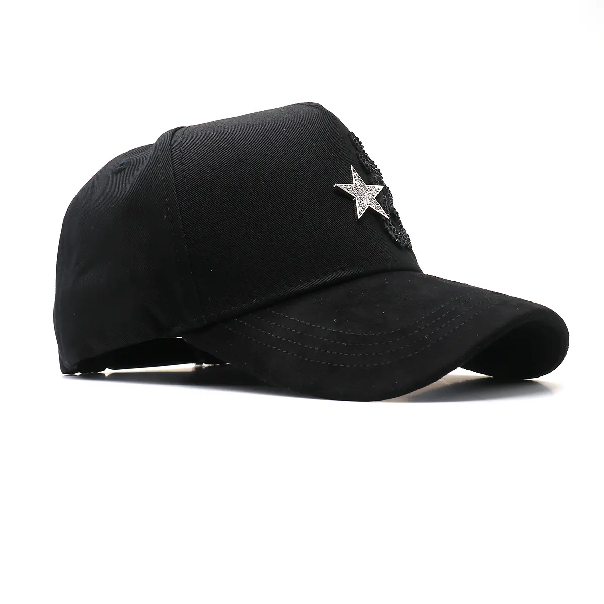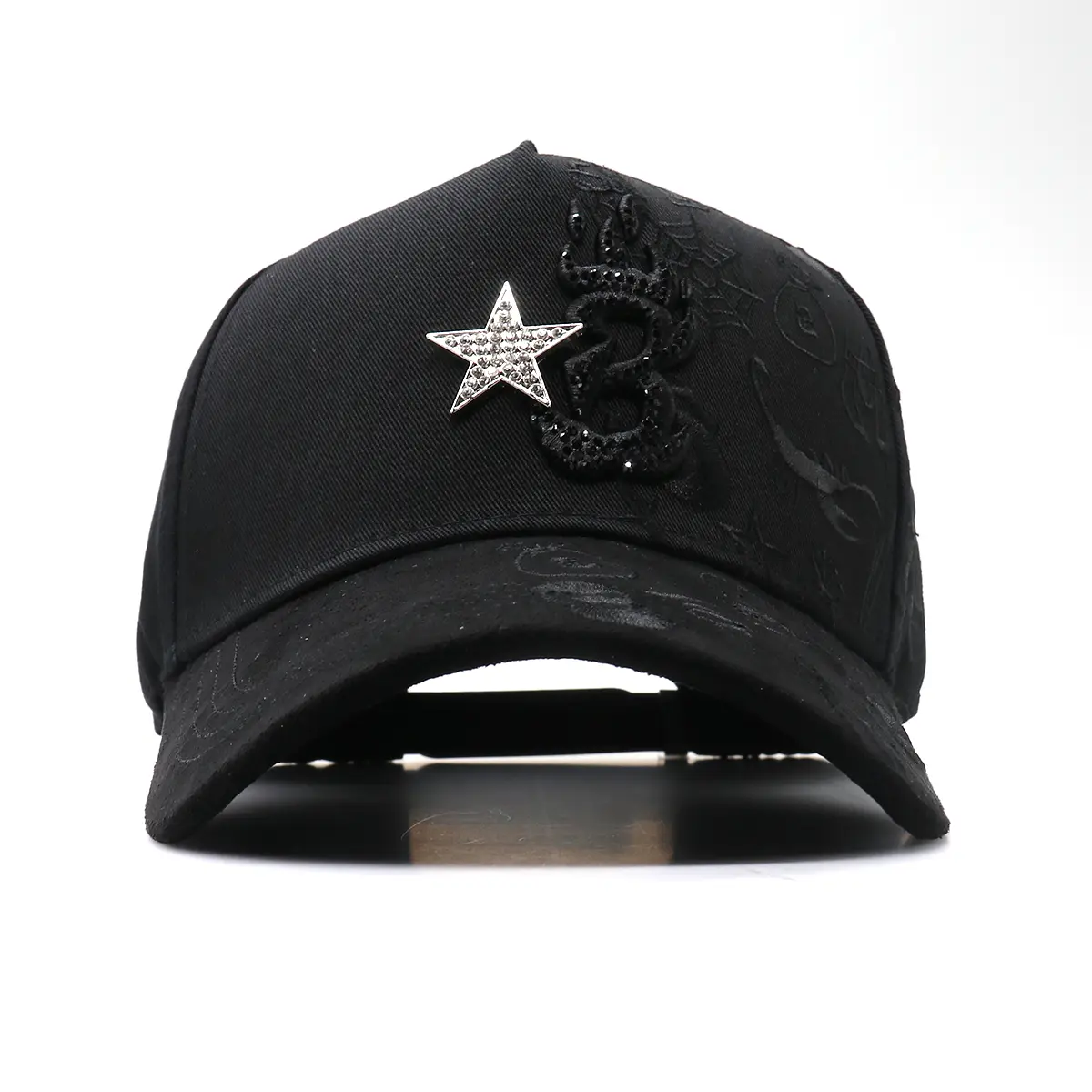 Streetwear Bling Cap with Rhinestone Star & Gothic Motif, Adjustable Hip Hop Snapback with Embossed Texture