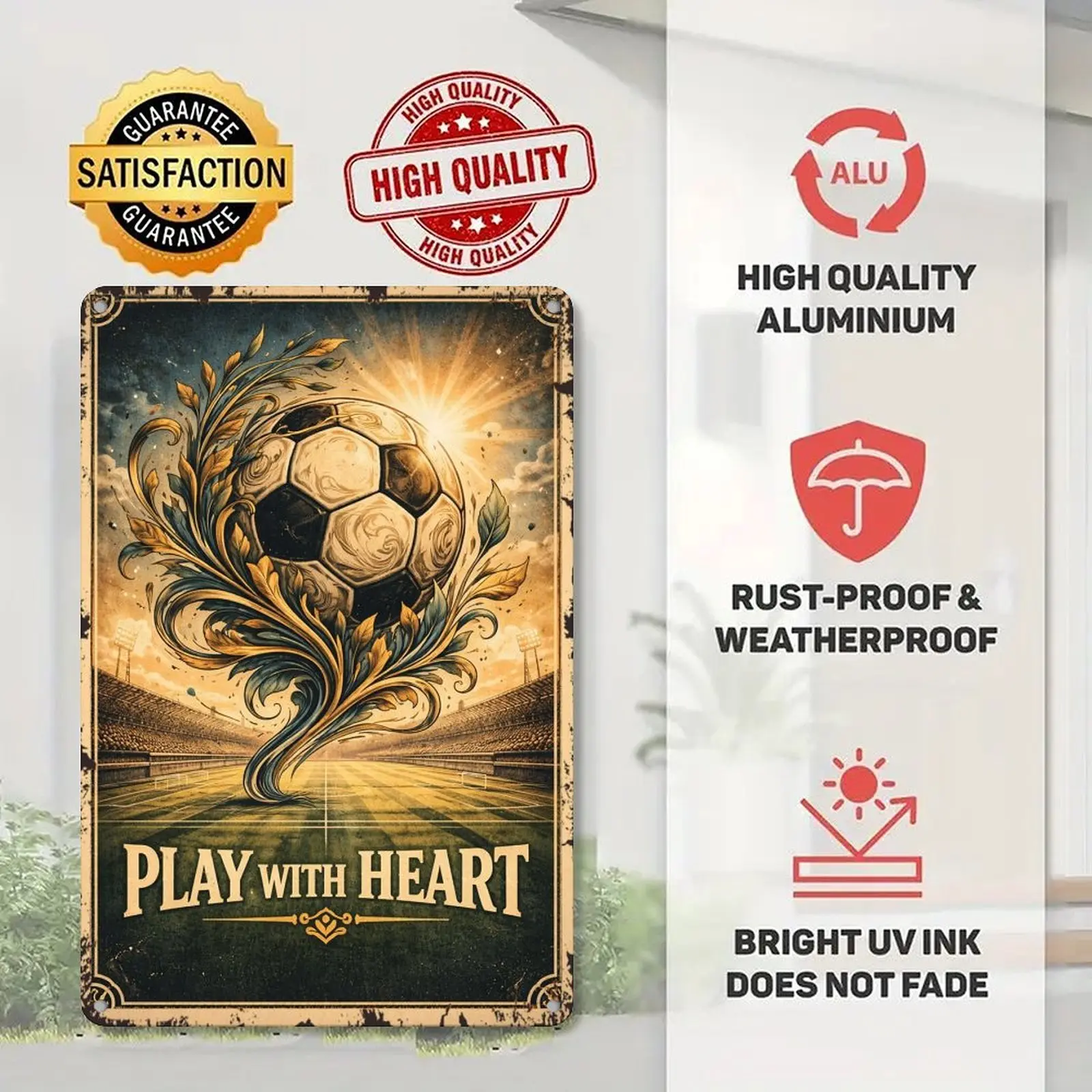 This poster is a statement piece that combines nostalgia with modern aesthetics. The "Play with Heart" slogan adds a motivational touch. Display it proudly and let it inspire your surroundings. Perfect for any setting where a touch of vintage soccer charm is desired.