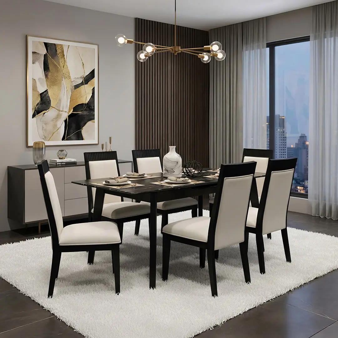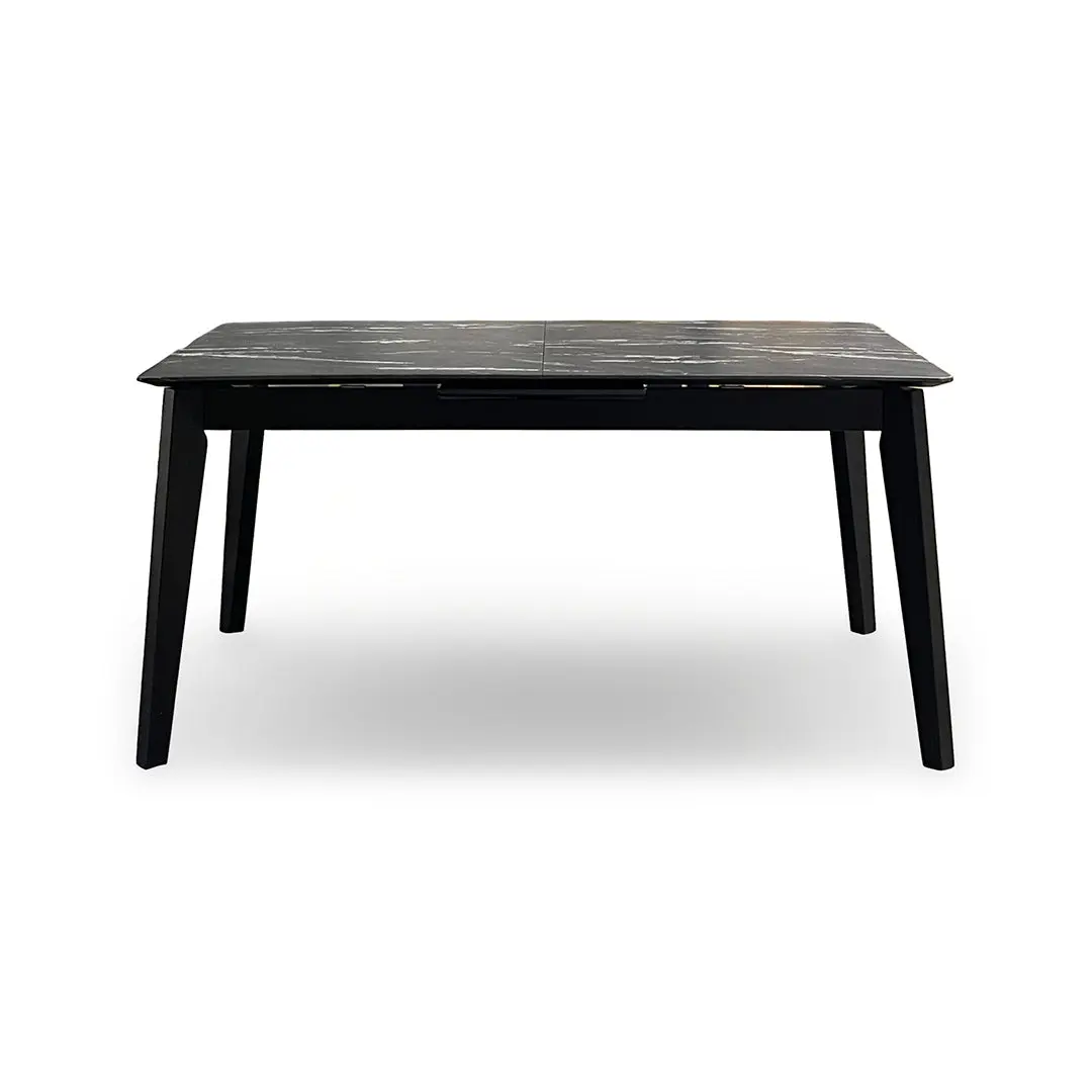 The Crestmont Dining Table brings clean contemporary style to the dining room with a sleek rectangular silhouette and a striking faux marble top. Designed to seat up to 6 comfortably, this dining table features an easy-to-operate smart top with an 18-inch self-storing leaf that expands the table up to 78 inches when you need extra room. The high pressure laminate surface offers the refined look of marble with easy, everyday use, making it a smart choice for busy homes. Its dark finish and streamlined profile create a modern look that feels polished without overwhelming your space. Rated at a “Good” quality level, the Crestmont Dining Table is a versatile piece that makes both daily meals and casual gatherings feel effortlessly put together.