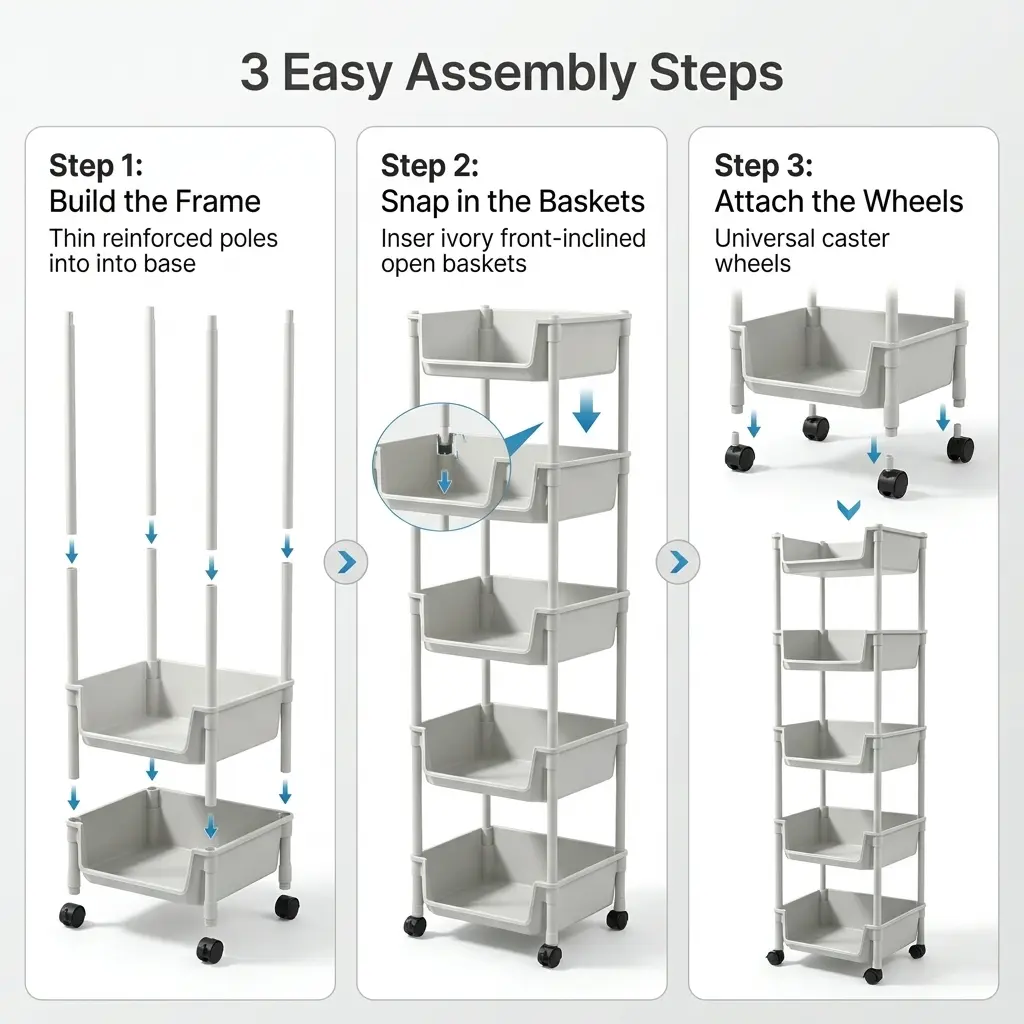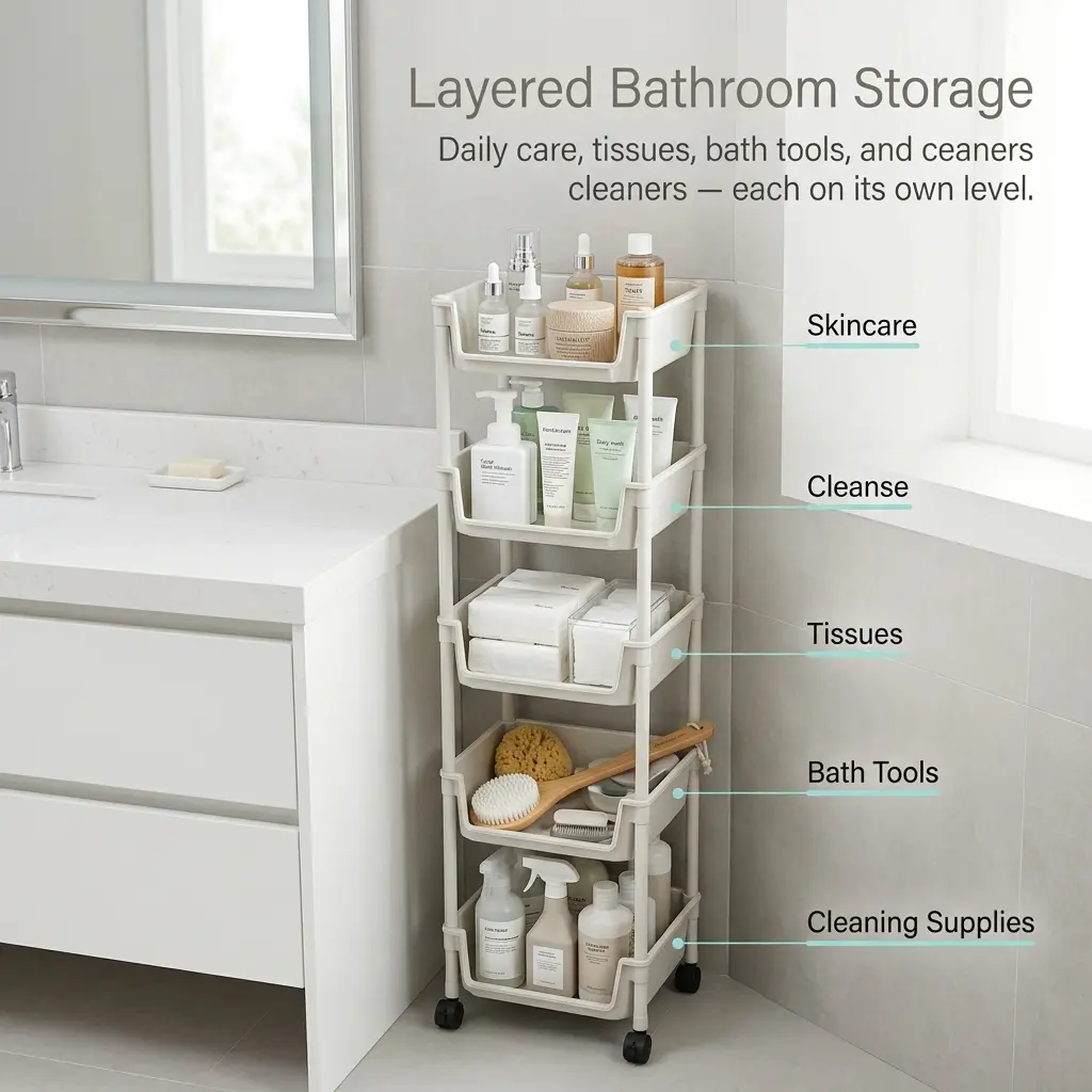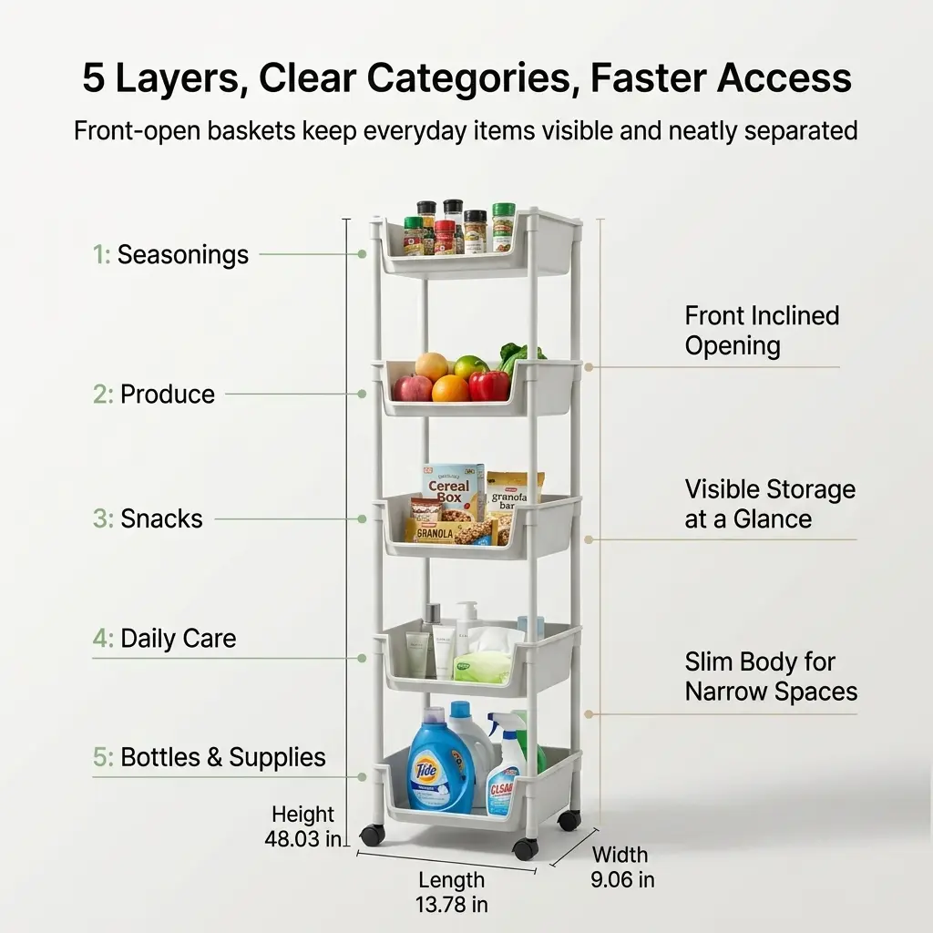 5-tier open storage for toiletries, snacks, produce, toys, books, and daily essentials