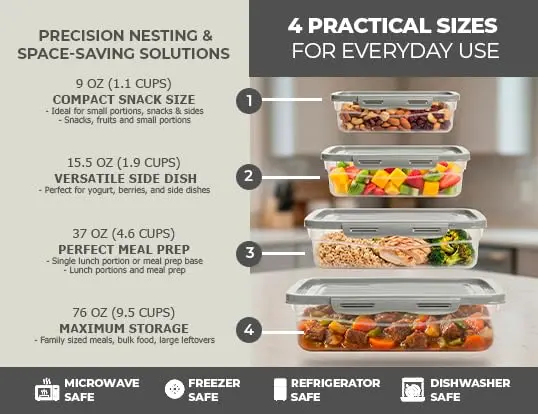 This set includes four versatile sizes: 9oz, 15.5oz, 37oz, and 76oz – ideal for snacks, ingredients, leftovers, or meal prep.