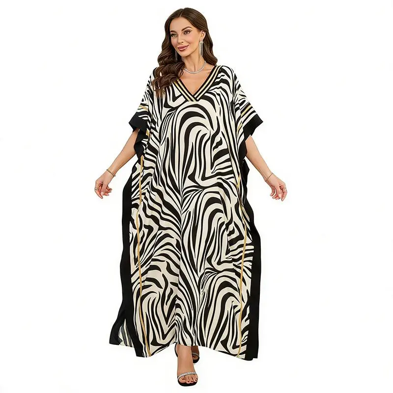 Plus Size Mumu Dresses for Women - Boho Batwing Sleeve Caftan with Side Slits, Long Moo Moo Nightgown & Beach Cover Up - Beige Zebra