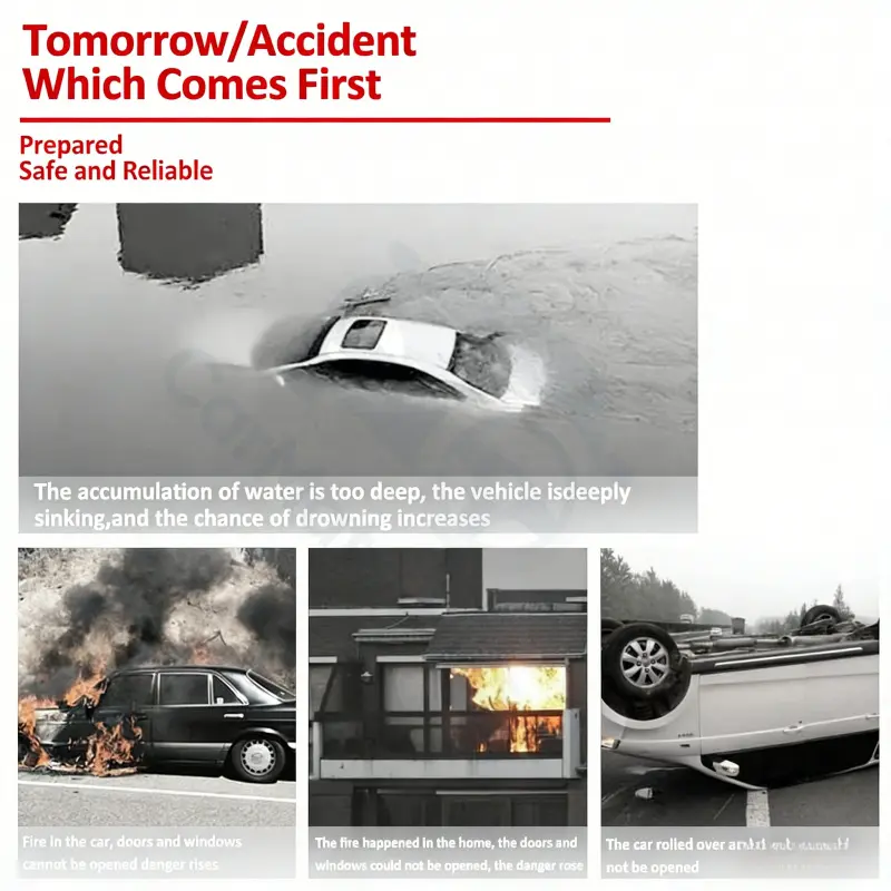 Seat Belt Cutter: The seat belt cutter features a built-in stainless steel cutter with a U-shaped hidden knife edge design, ensuring safety and preventing hand injuries.Simply align the U-shaped mouth of the cutter with the seat belt, push it forward swiftly, and get out of the vehicle easily and quickly.