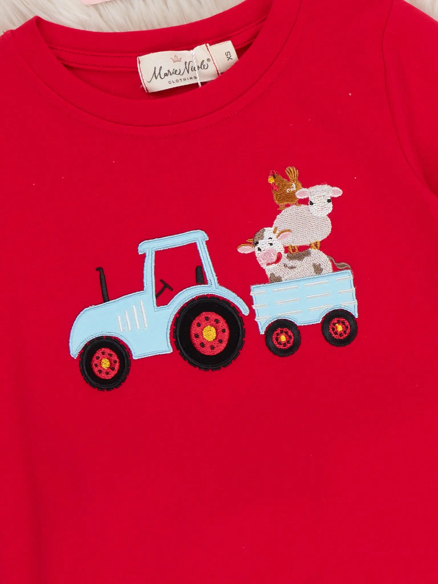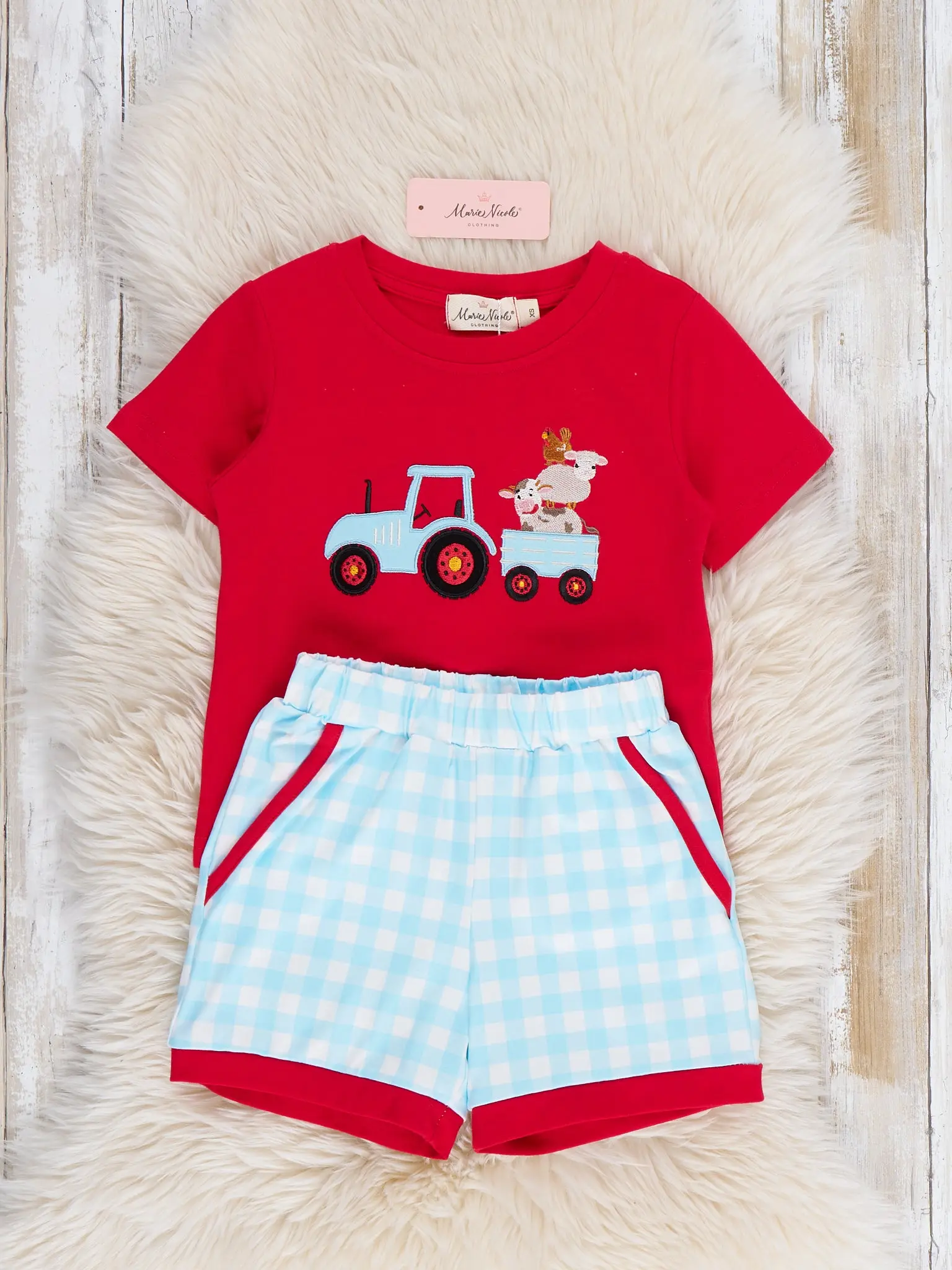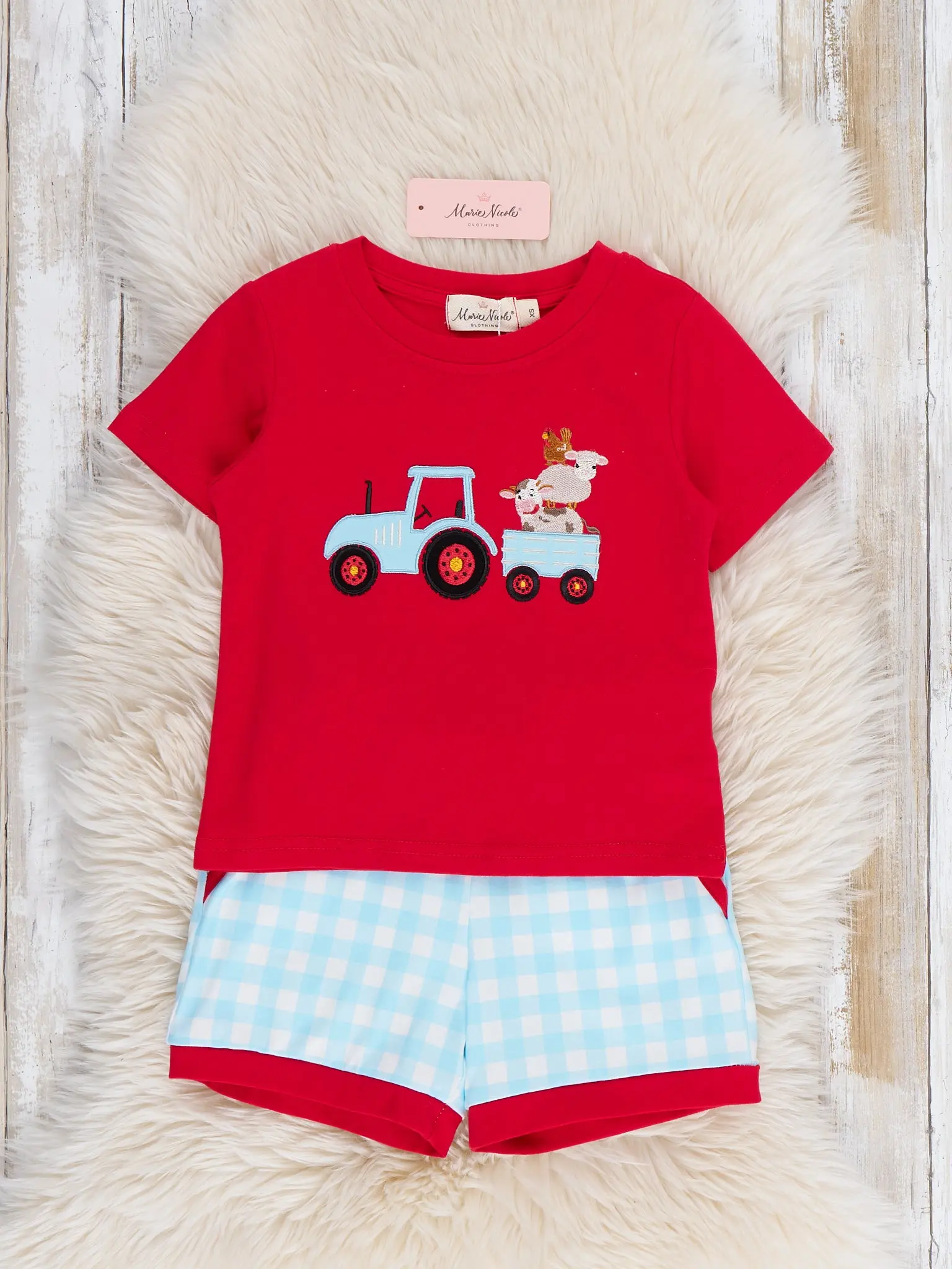 The Little Tractor Helper Embroidered Plaid Outfit by Marie Nicole Clothing features a fun tractor embroidery and a comfy, casual design. The red top with the playful tractor graphic pairs perfectly with the gingham plaid shorts, making this set ideal for outdoor play, family picnics, and farm-themed fun. Its soft, breathable fabric ensures comfort for all-day adventures.