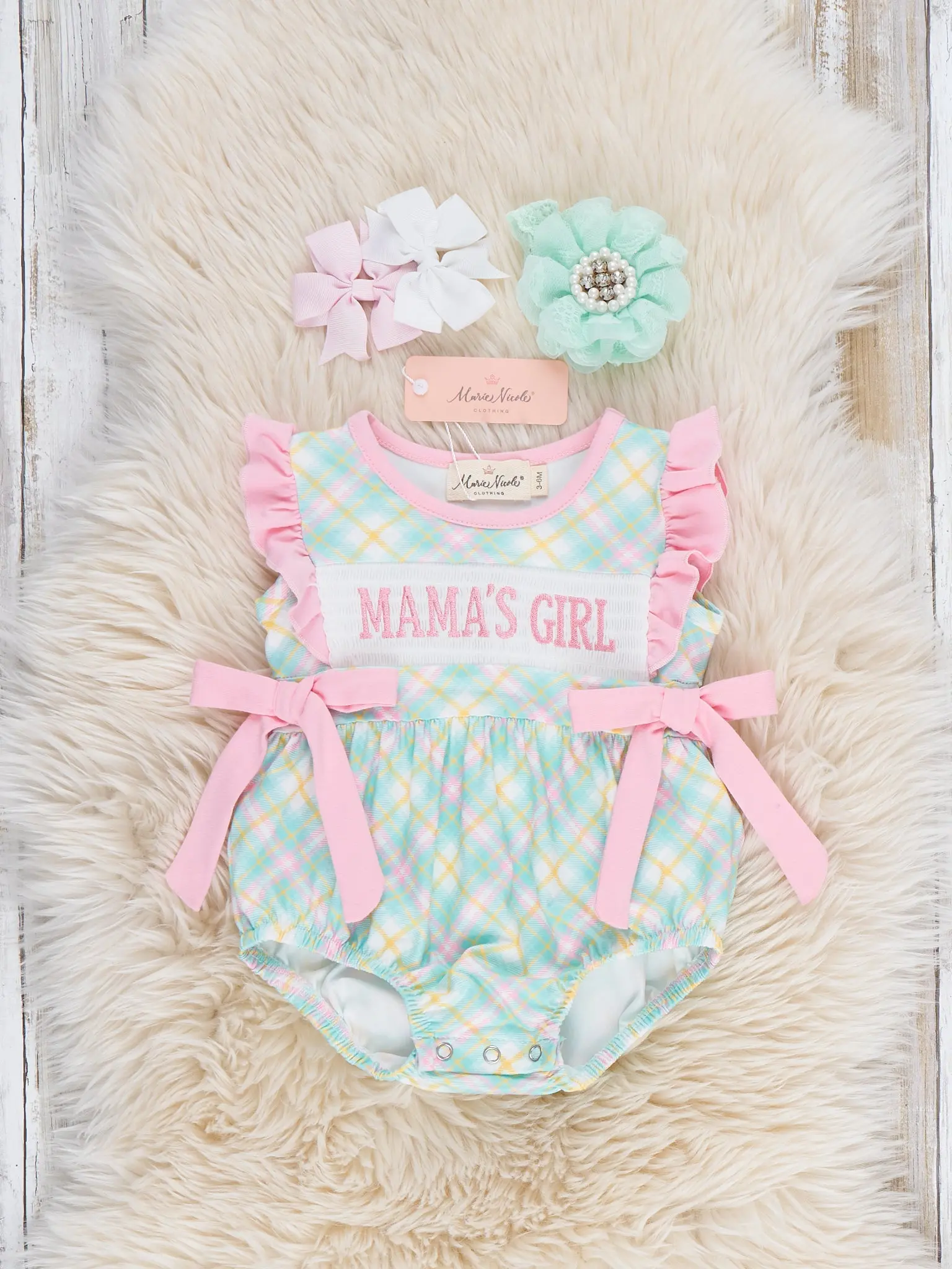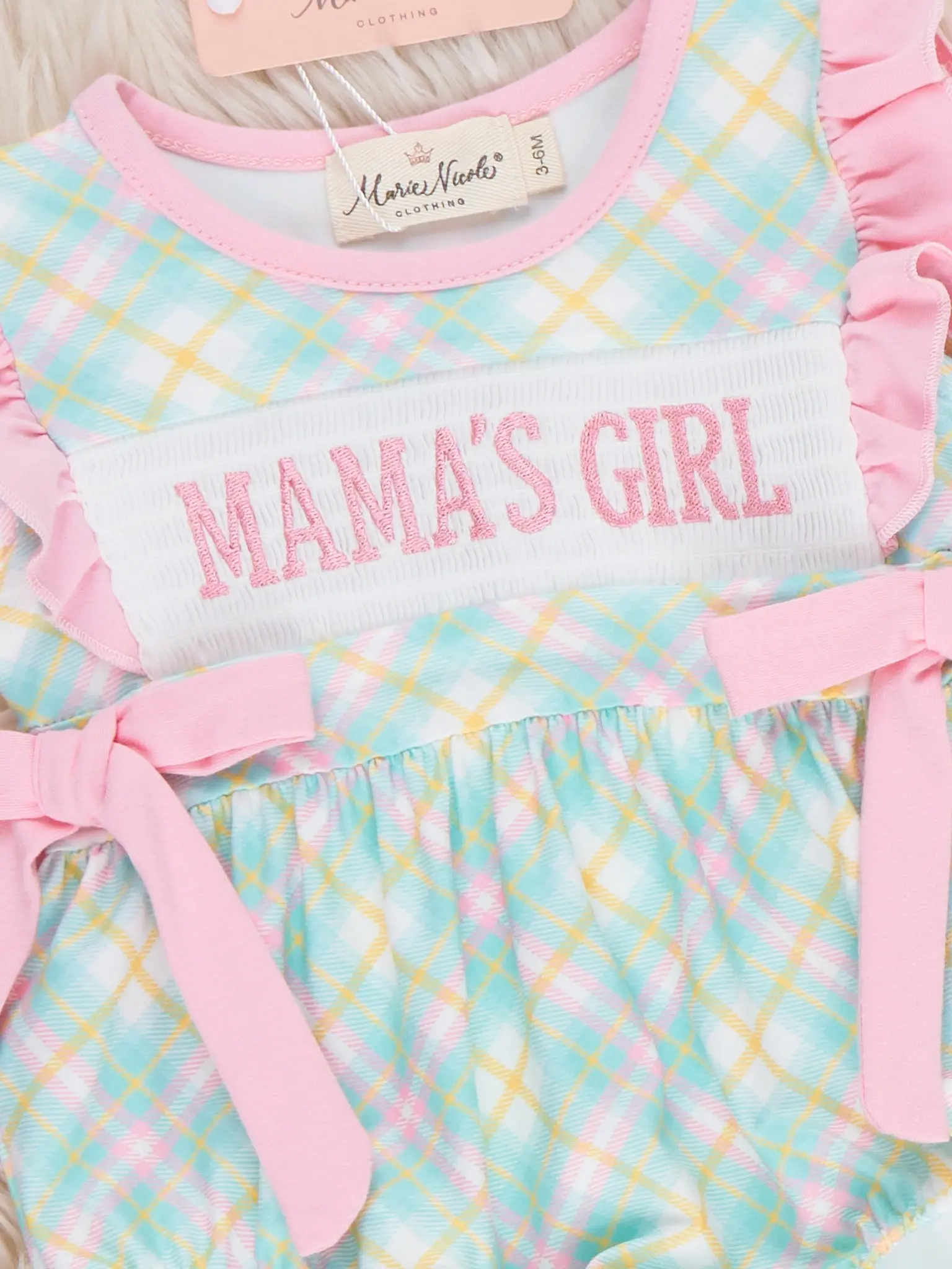 The Mama’s Girl Pastel Plaid Smocked Ruffle Bubble Romper by Marie Nicole Clothing features a sweet “Mama’s Girl” detail with flutter sleeves, soft pastel plaid fabric, and delicate ruffle accents. Charming bow ties at the waist add a classic boutique touch while snap closures make dressing and diaper changes easy. Soft, breathable fabric keeps little ones comfortable, making this romper perfect for everyday outings, family gatherings, and special moments.
