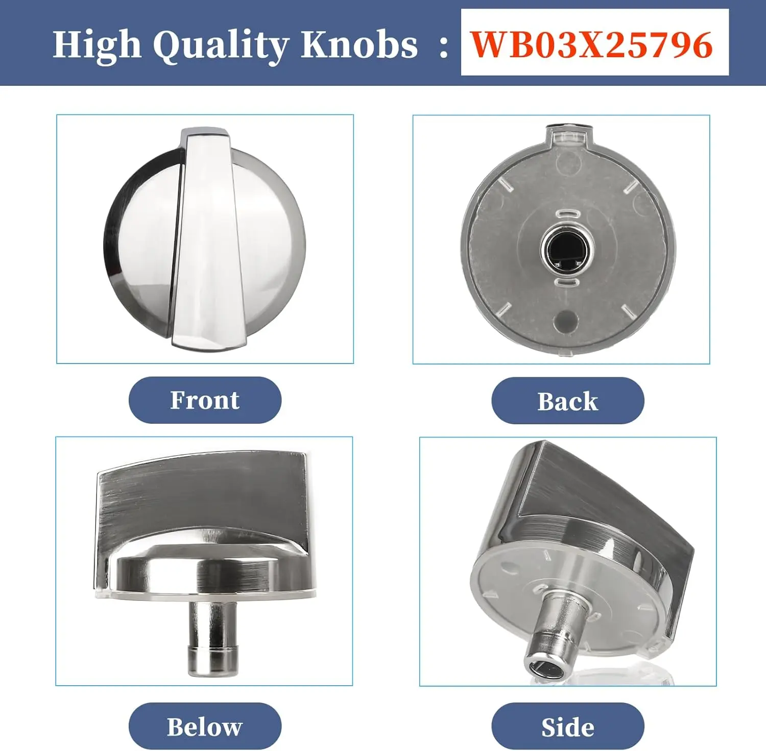 ·【High Quality & Higher Heat Resistant】WB03X25796, WB03T10326 Heavy duty burner replacement knobs are made of heat-resistant, weighted plastic with internal metal reinforcement tabs that have been tested multiple times by the manufacturer to ensure a highly durable product. The gas stove knob finish is satin/brushed for added durability and longer life. NOT an OEM part, but meets/exceeds OEM manufacturing requirements.