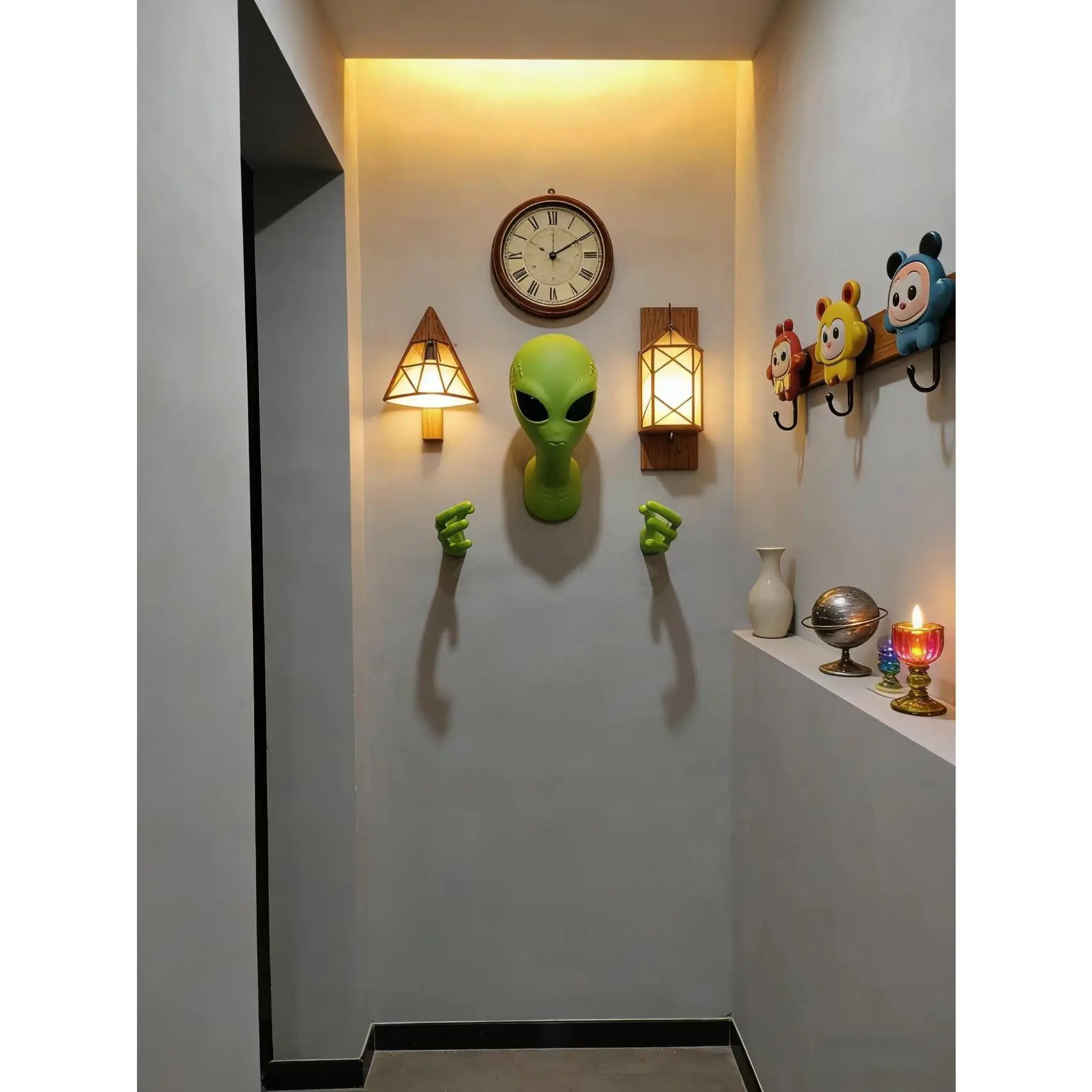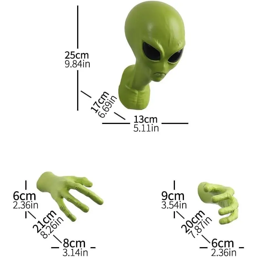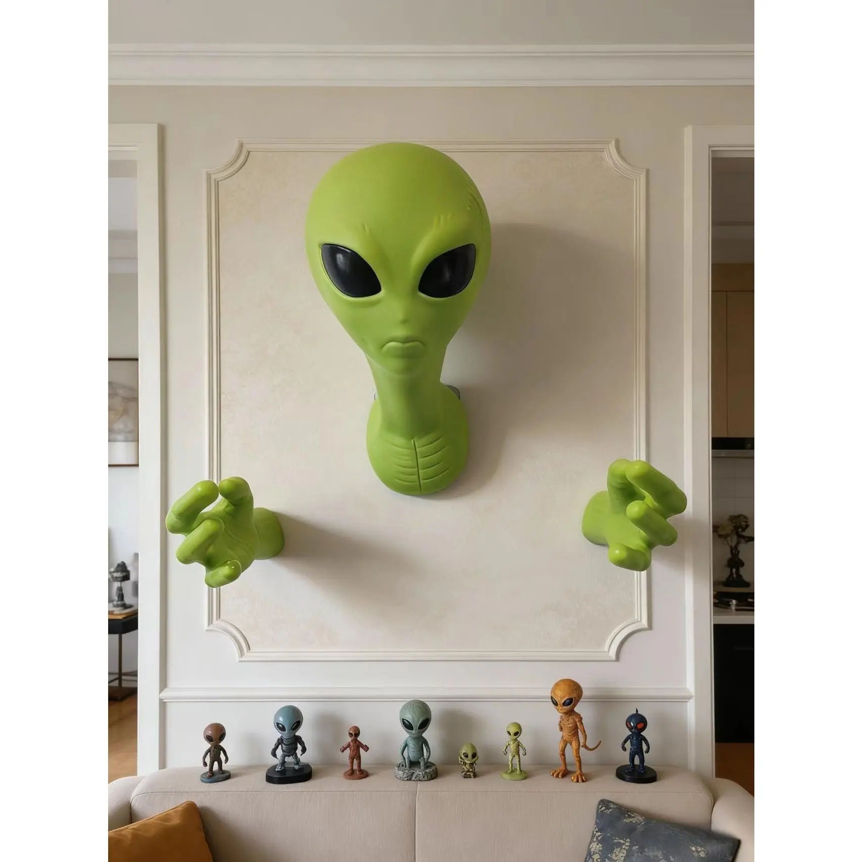 Green Alien Wall Sculpturet Latex Material 3D Alien Sculpture Head and Hand Small Statue Wall Hanging Area 51 Sci-Fi Decorative Collectible Hanging Ornament