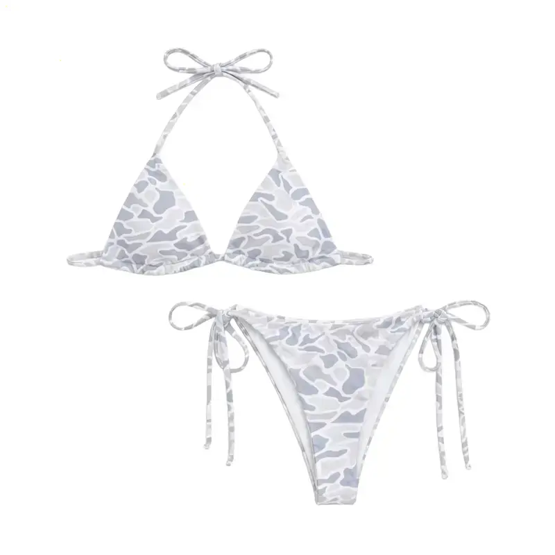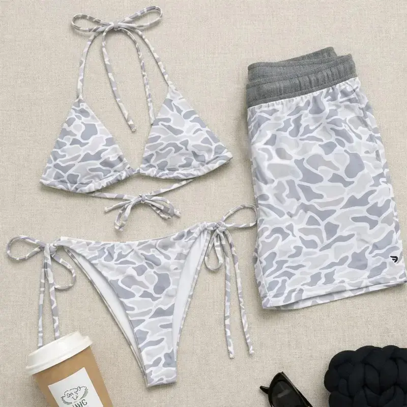 This set includes a women's triangle tie bikini and a men's short, ideal for beach vacations. It's a stylish choice for couples looking to match in style. The grey camo design adds a unique touch to your beachwear. Perfect as a gift for her, this set is a thoughtful and fun present.
