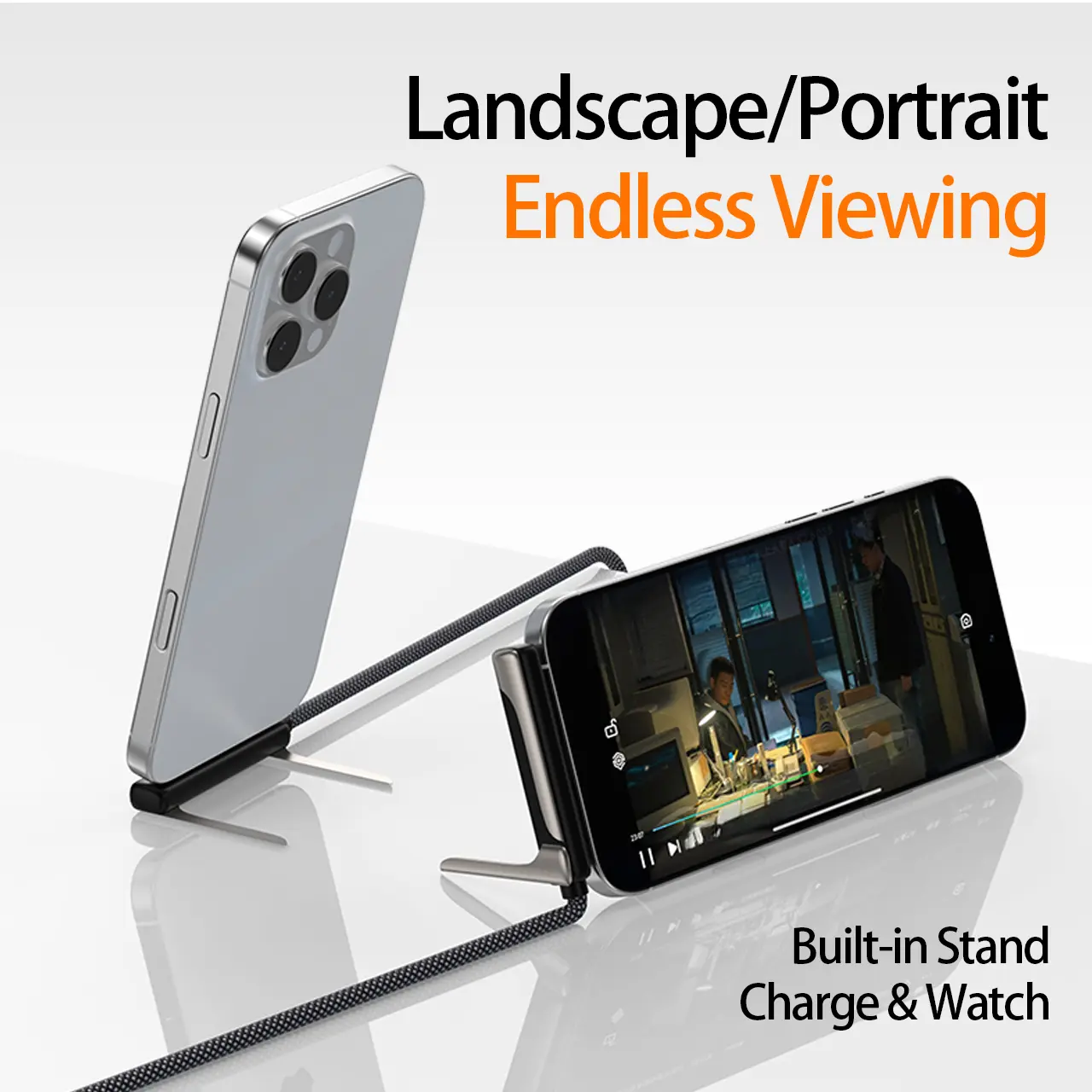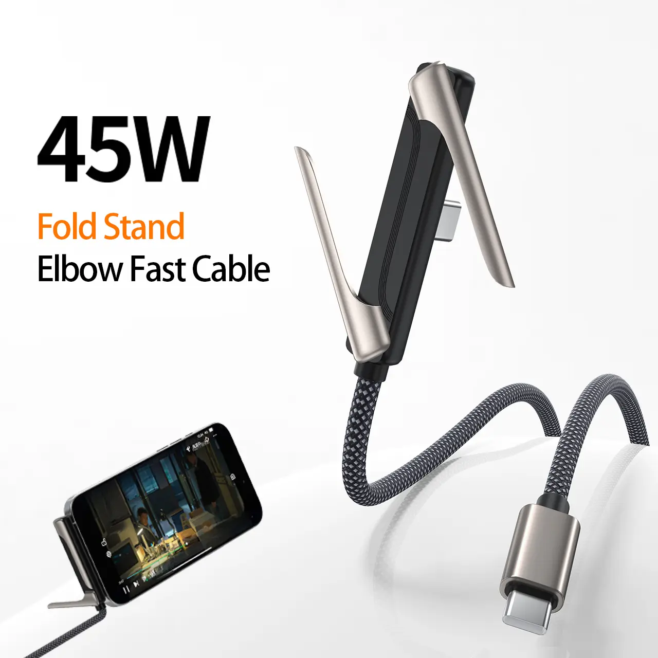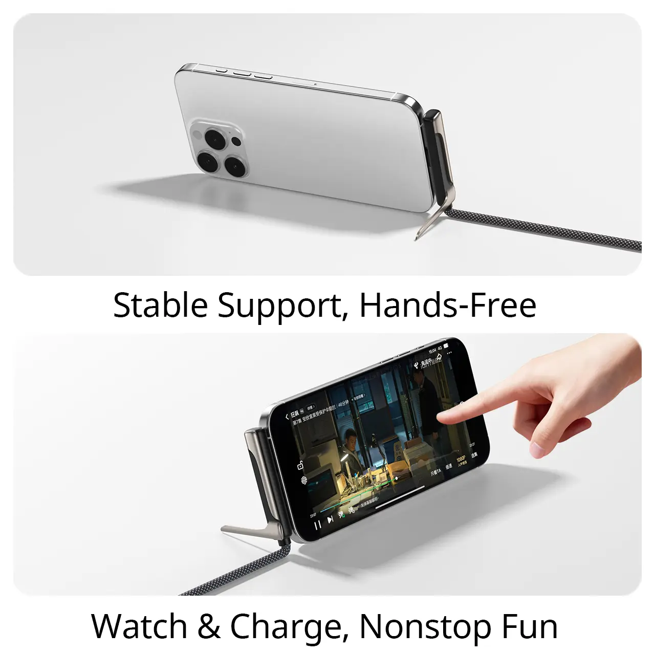 This is a data cable with a phone stand, compatible with Apple and Samsung phones. You can charge while watching TV, and the charging cable integrates with the stand.