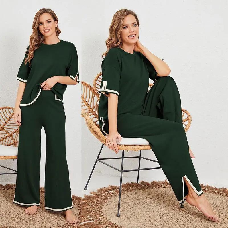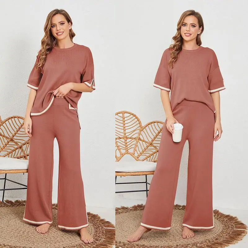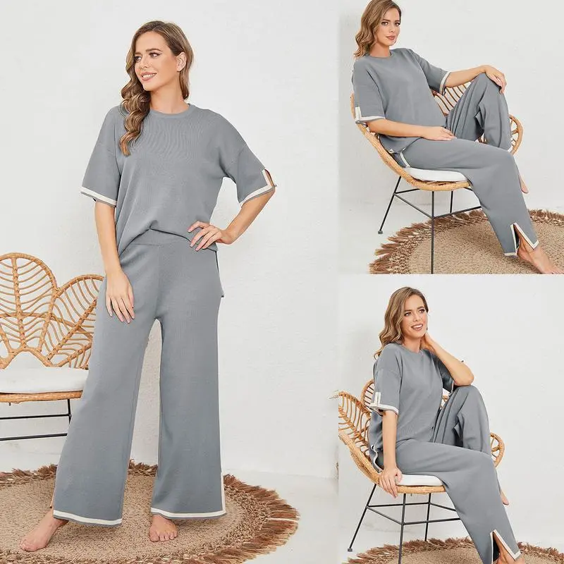 Sweater Sets Women 2 Piece Lounge Sets Short Sleeve Knit Pullover Tops Wide Leg Pants