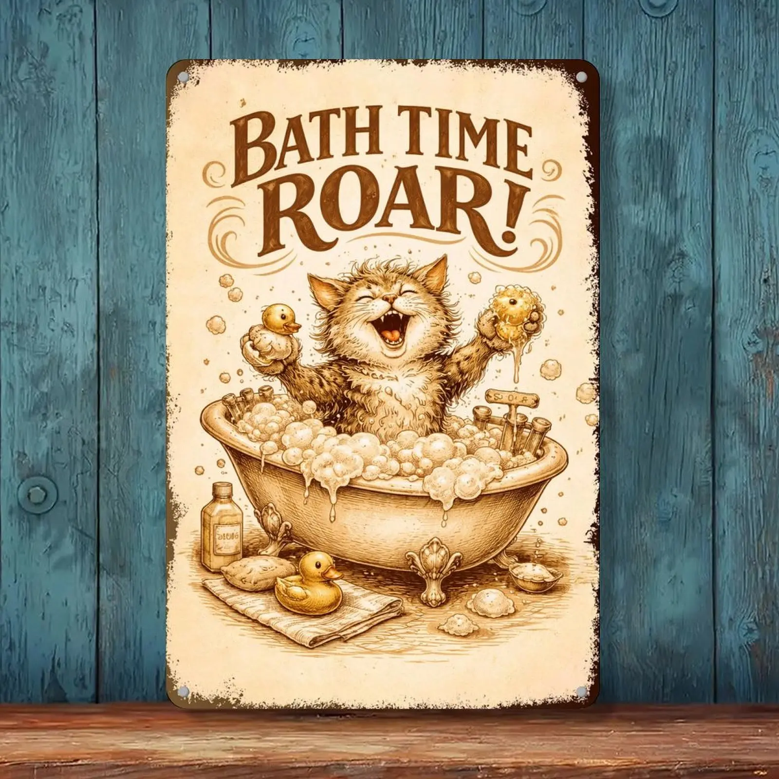 Bath Time Roar – Funny Cat Bathtub Art Print – 8x12 Inch Metal Sign for Bathroom, Kitchen, or Home Decor