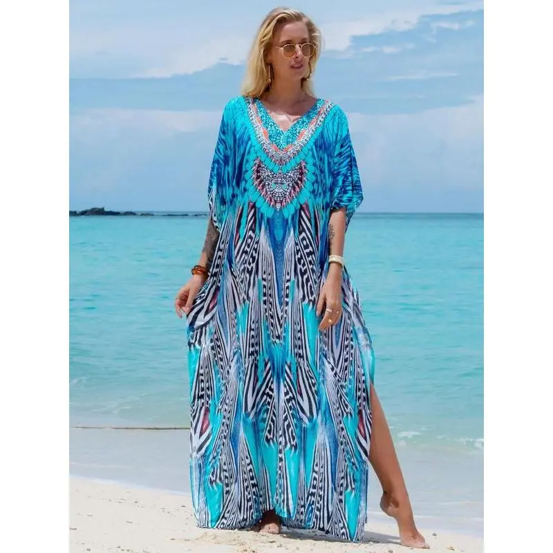 Dress Style:BohoWeaving Method:WovenComposition:ViscoseClothing Type:KaftanDress length: LongWashing Instructions:Cold WashStyle:BohoSeason:SummerSleeve Type:Batwing SleeveSleeve length: half sleeveNeckline:Deep V NeckQuantity Per Pack:10Region Of Origin:ChinaPattern:All Over PrintMaterials:WovenCountry of Origin:China