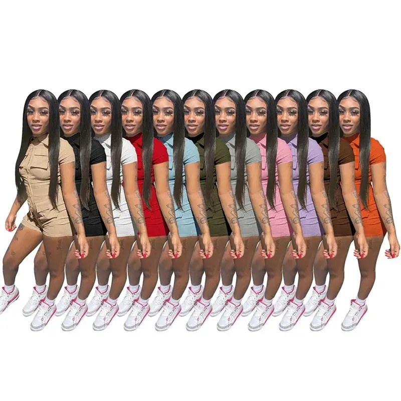 Streetwear Zipper Pockets Shorts Jumpsuit Women Clothing Short Sleeve Skinny Cargo Playsuit Summer Casual Pieces Romper