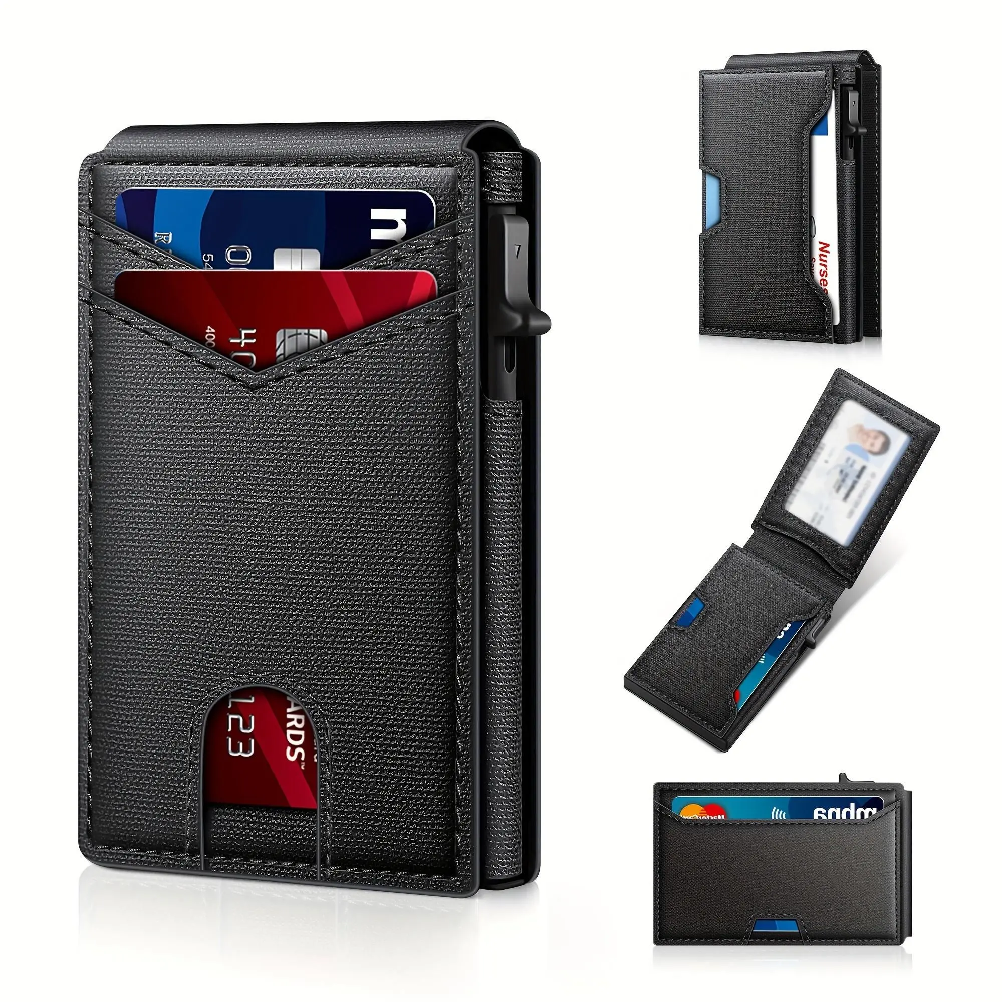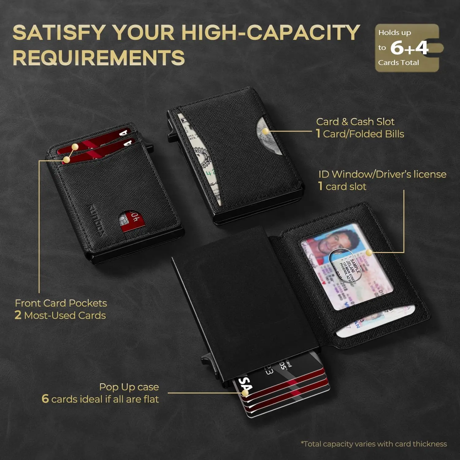 ·QUICKEST ACCESS: Get instant card access with just one hand by tapping a button. The front pocket holds your 2 most-used cards, while the pop-up aluminum card holder stores 1-7 cards (The actual capacity depends on the card thickness ) . Features an ID window for your driver's license and a back pocket that fits one card or cash