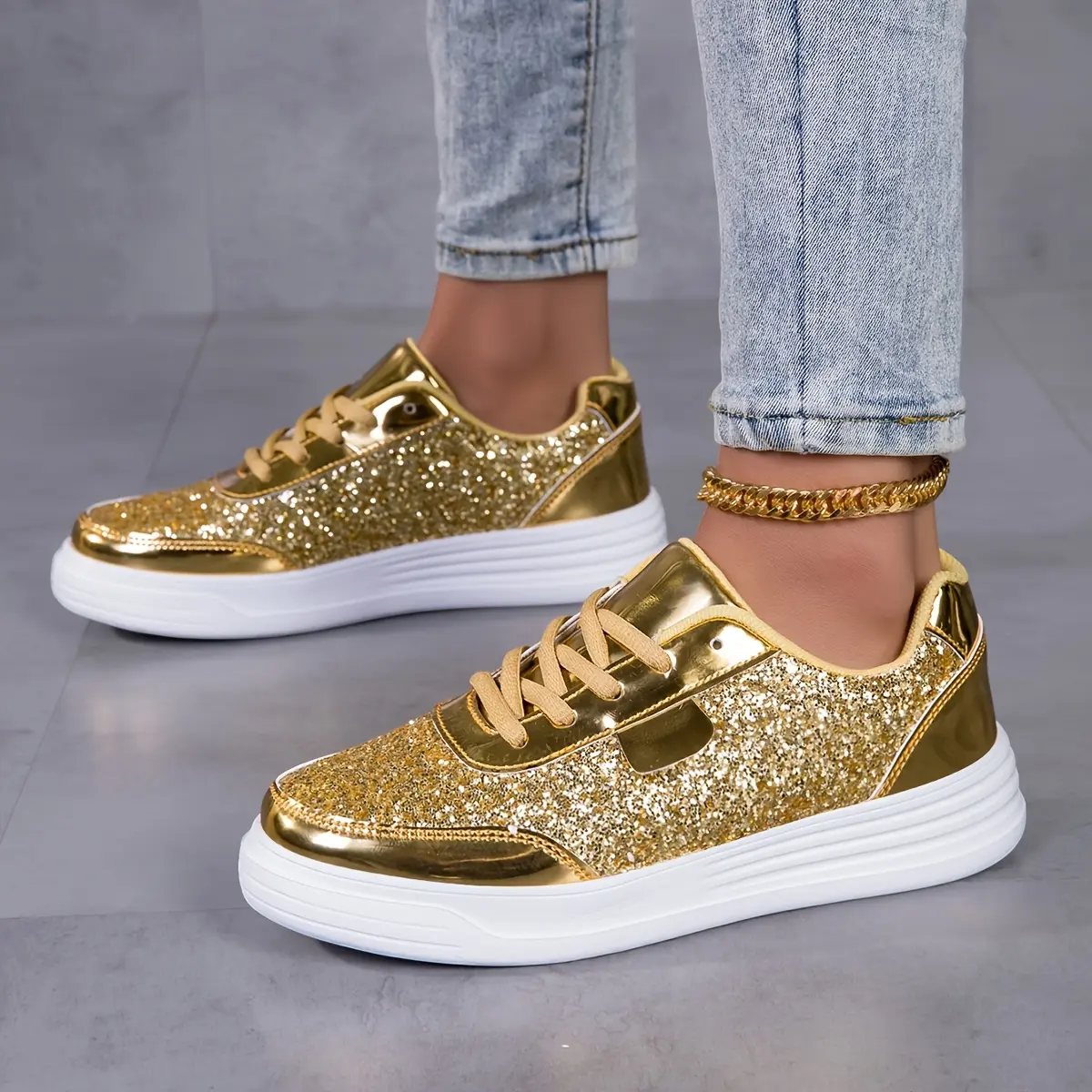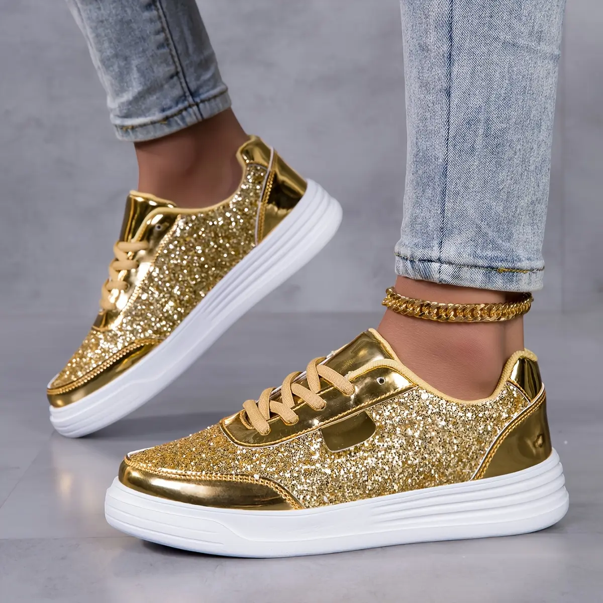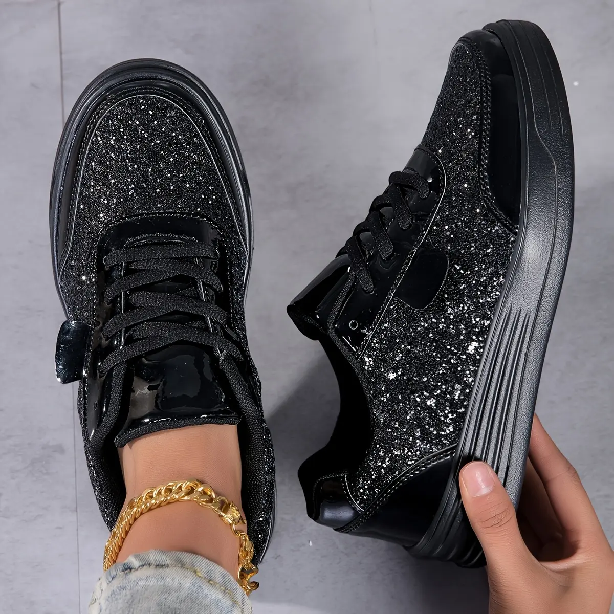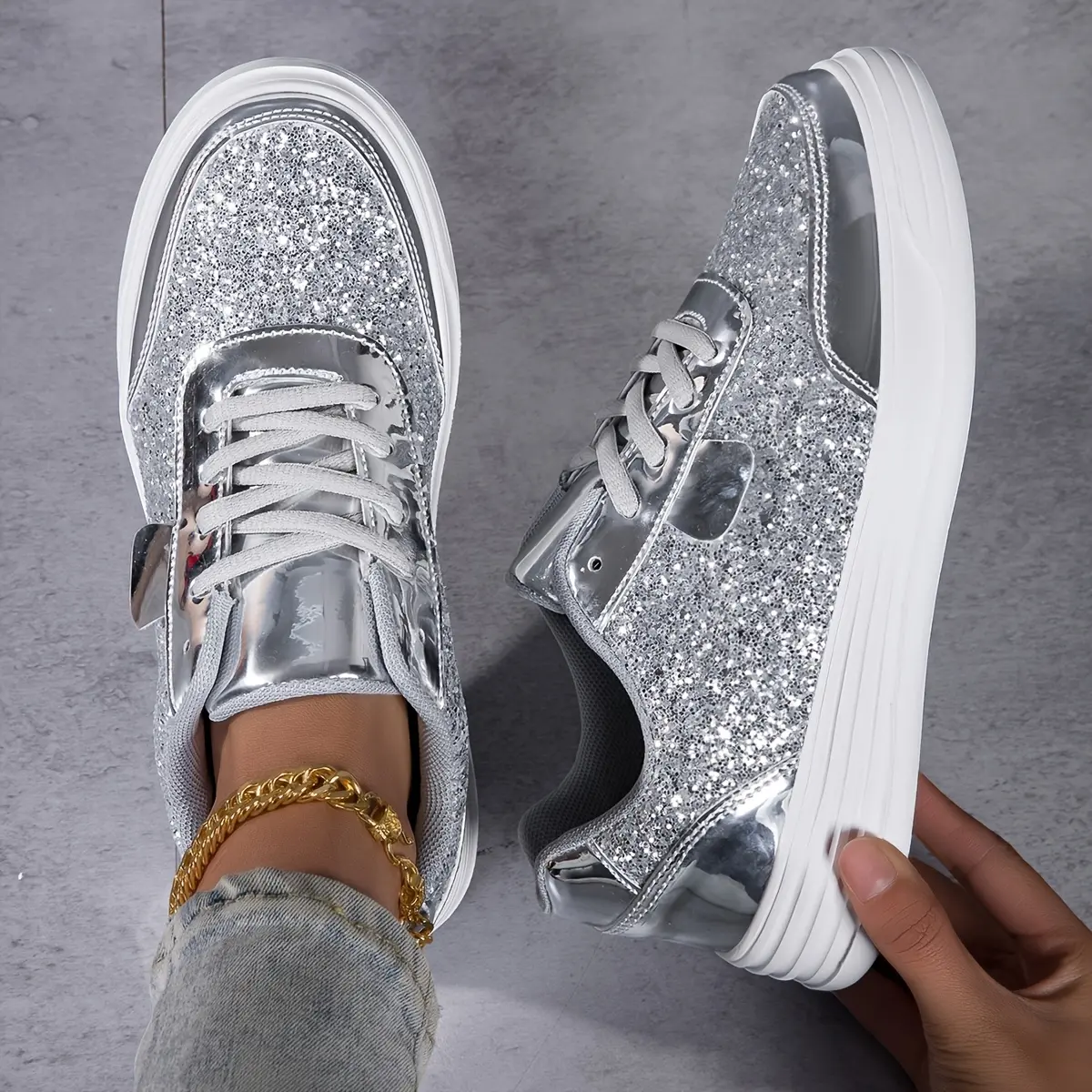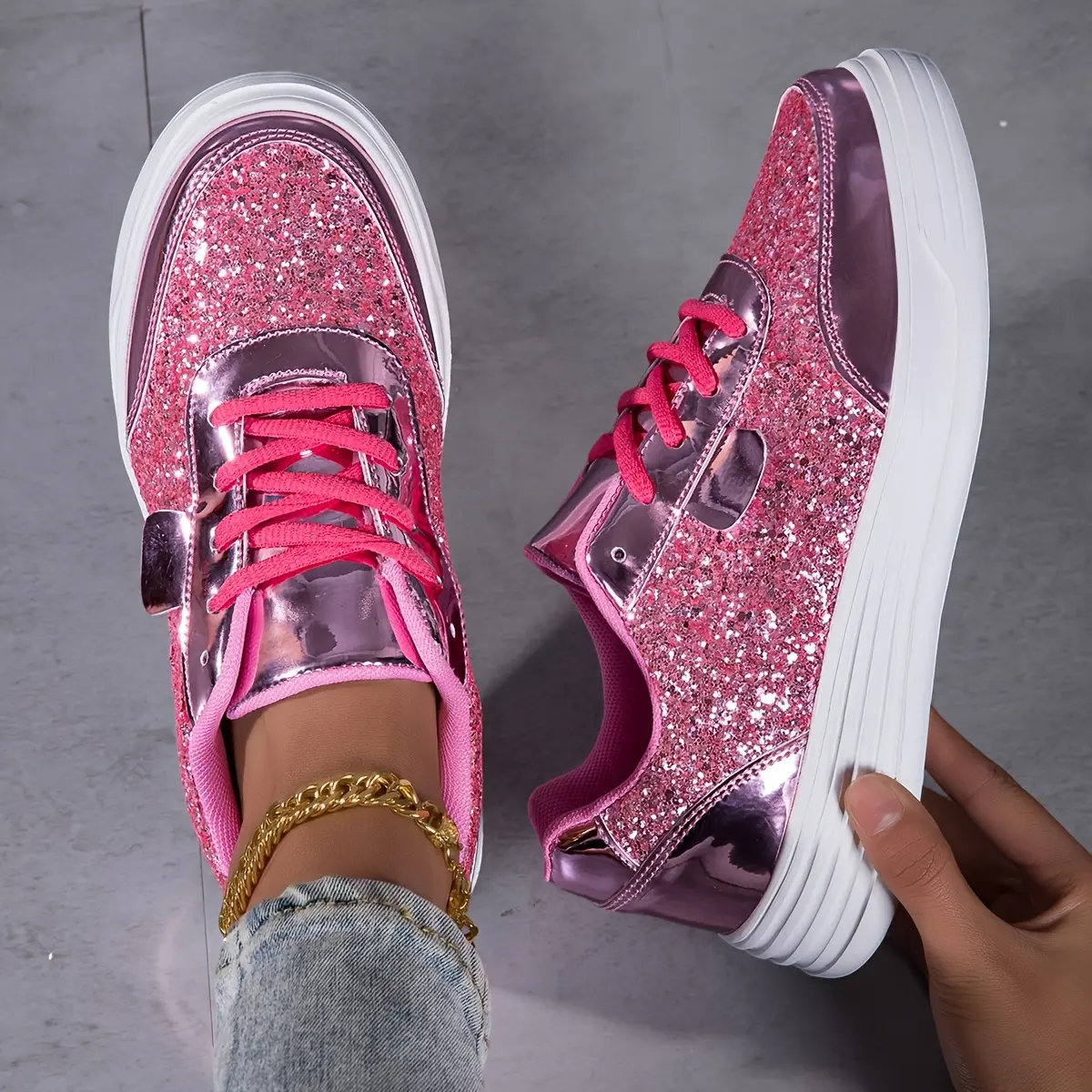 Women's fashion glossy sneakers with sparkling sequins, running shoes, street skate shoes, non-slip spring summer mesh breathable lace-up casual shoes, thick sole height incr dance shoes, lightweight soft sole low-top walking shoes