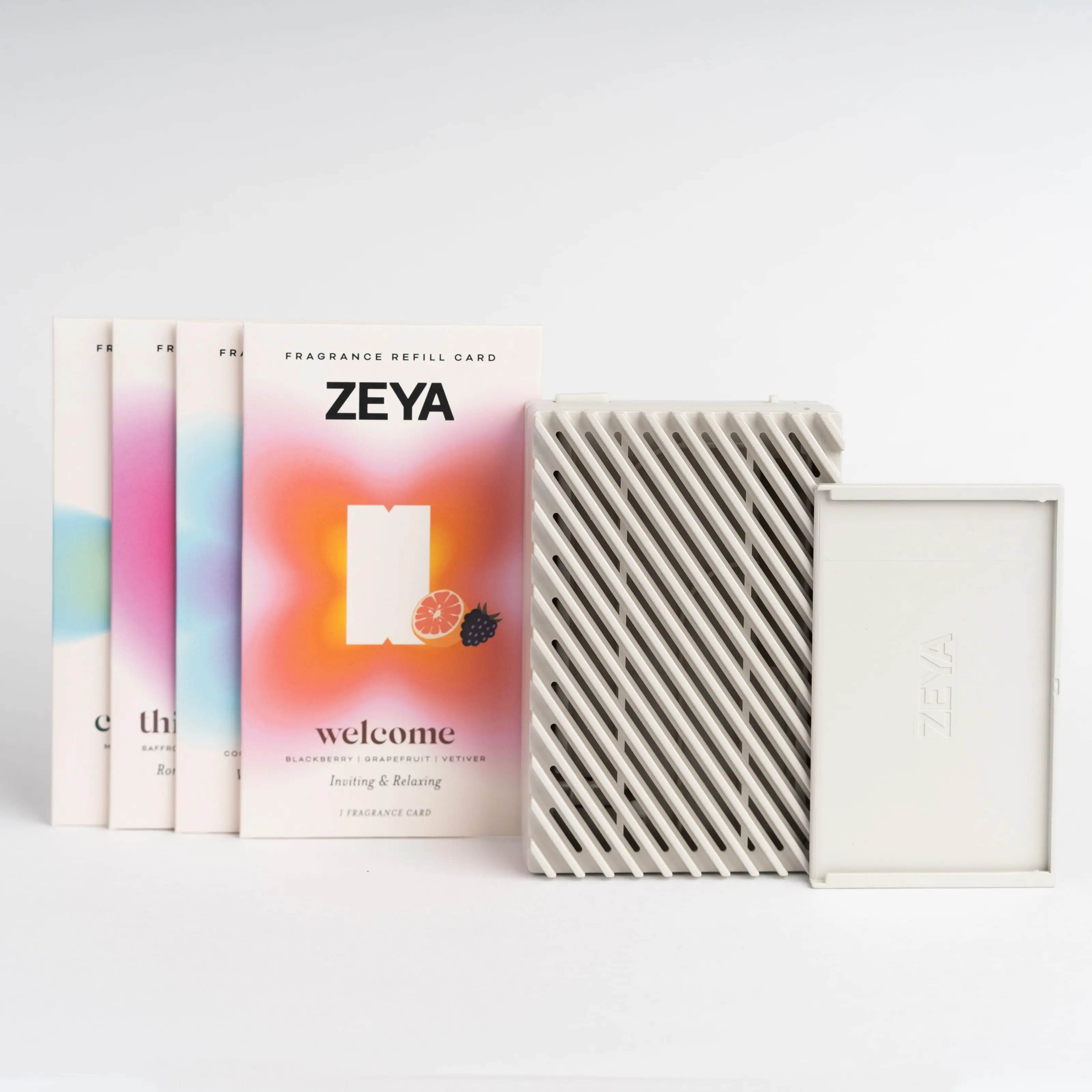 This sampler bundle includes one (1) ZEYA Portable Diffuser and four (4) ZEYA Fragrance Refill Cards. Try all four of our signature scents and discover the fragrances that feel most like you.