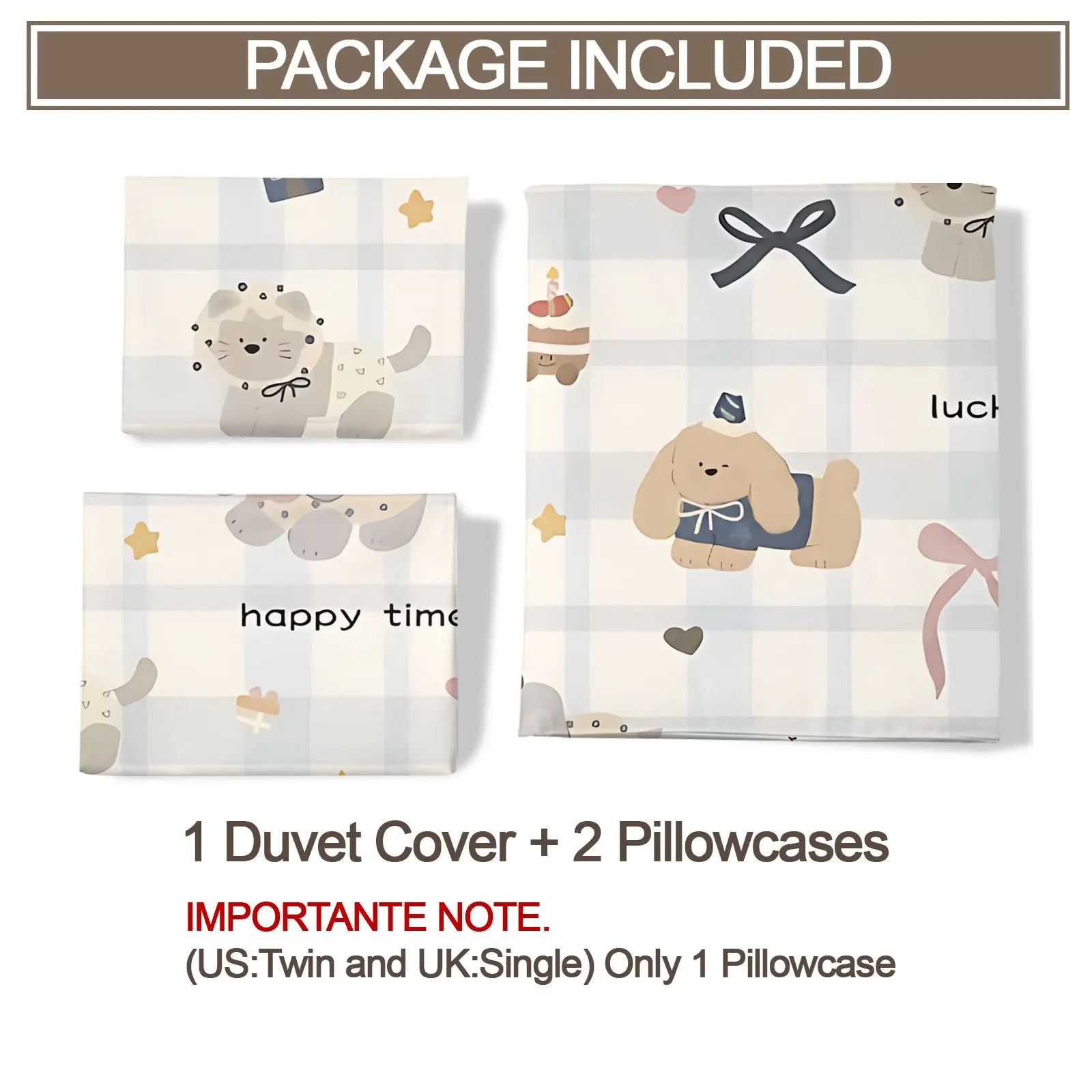 3-Piece Korean-Style Cute Cartoon Bear Checkered Duvet Cover Set, Perfect for Teenage Boys. Ultra-Soft Bedding, Fits a Double Bed. Full Queen-Size Duvet Cover Set (Filling Not Included)