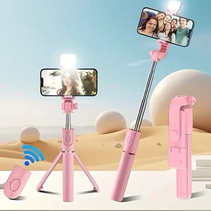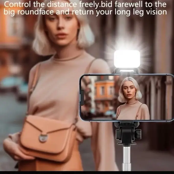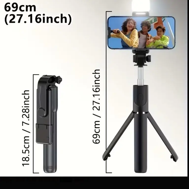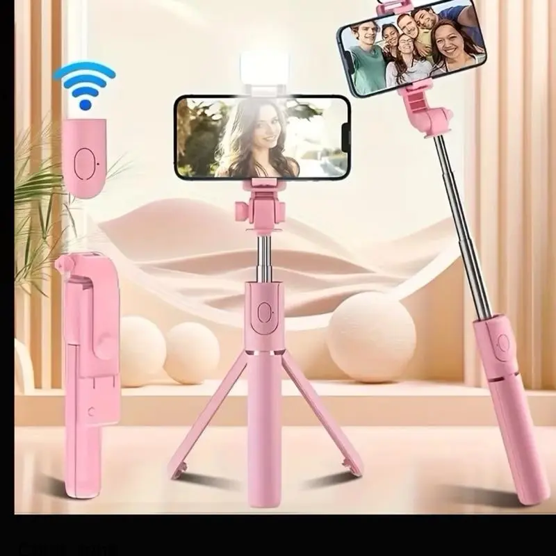 Expandable Selfie Stick for Phones Featuring an Integrated Fill Light, Designed for Professional Live Streaming. This Wireless Remote-Controlled Tripod Rotates 360° And Is Perfect for Hiking, Travel, Vlogging, And Outdoor Activities.