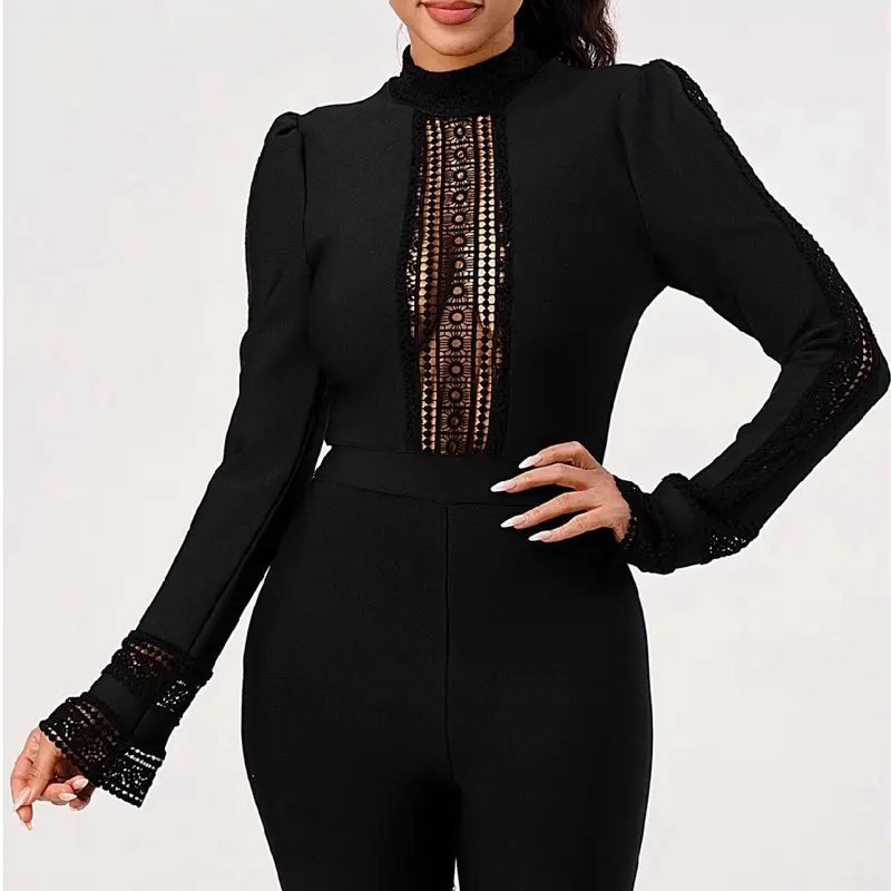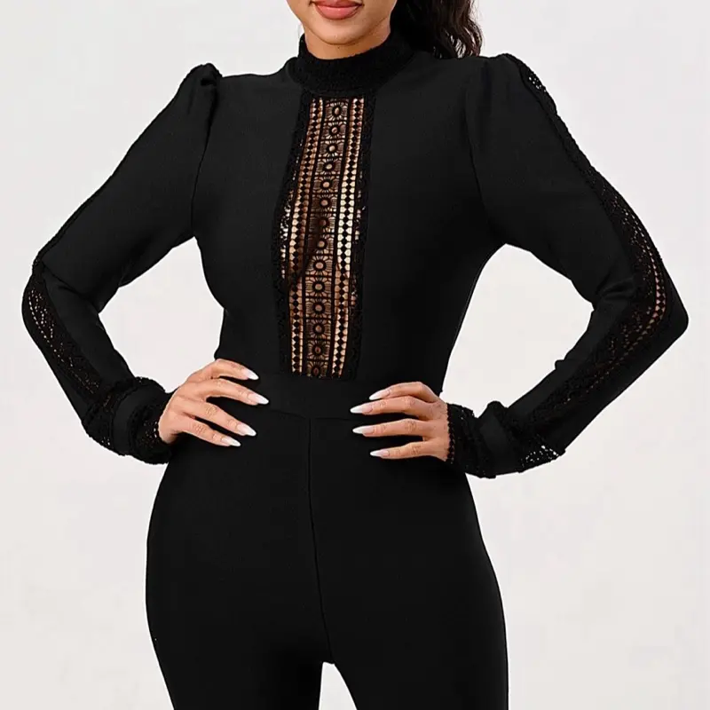 This MORE THAN ENOUGH LACE BANDAGE ROMPER- BLACK is made with high-quality fabric, imported and features black lace trim, long sleeve. It offers a classic and stylish look with superior comfort and support.