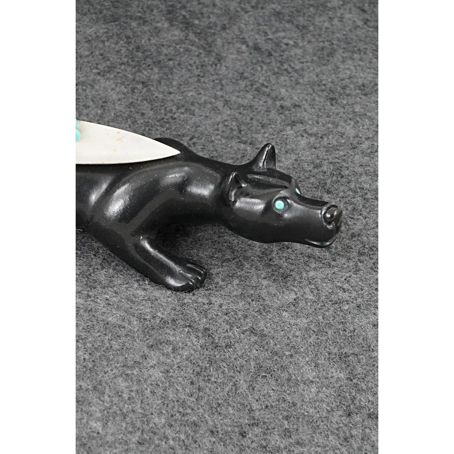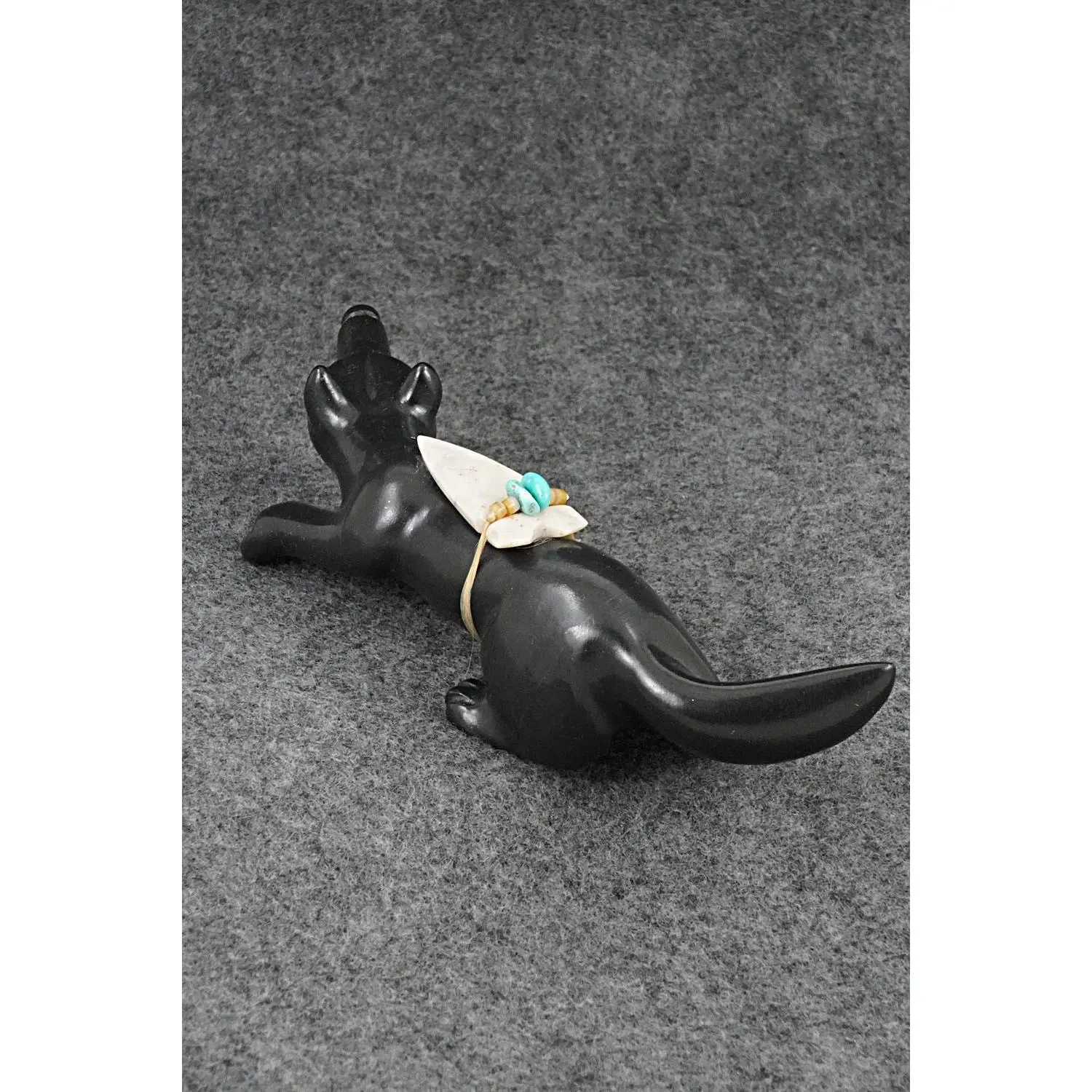 This wolf with arrowhead offering Zuni fetish was carved by Albert Eustace. The bottom is signed AE and Zuni.