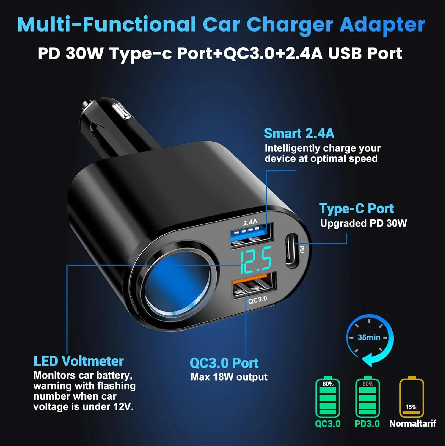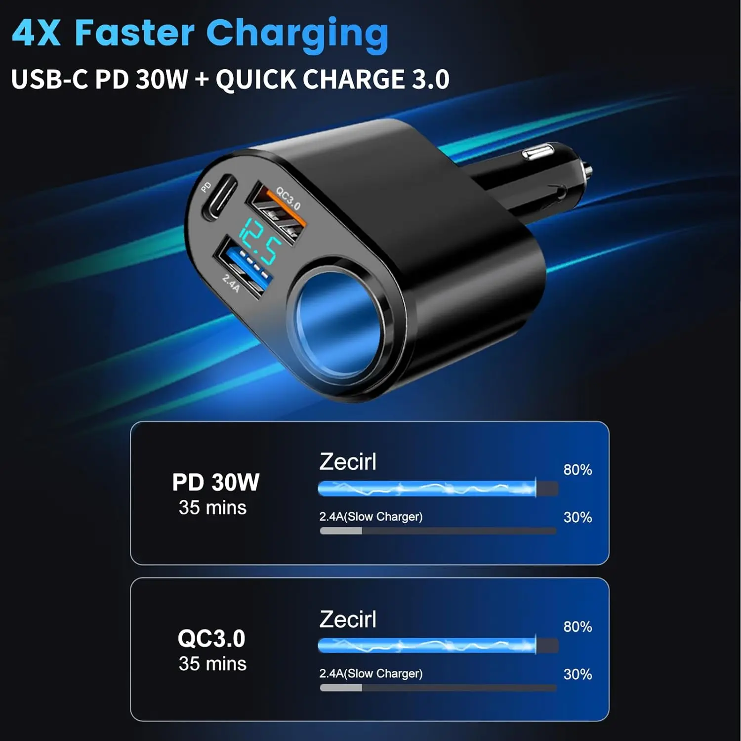 ✨ Dual Fast Charging Port: This USB C car charger supports PD 30W and 18W QC3.0 output. Charge your devices up to 80% in 35 minutes. The 2.4A Smart USB port charges 2.5X faster than usual car chargers. Note: It cannot fast charge two phones simultaneously.