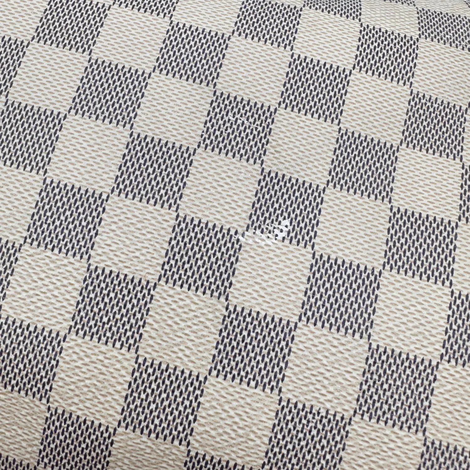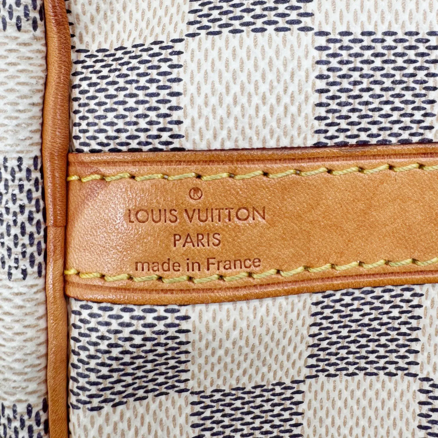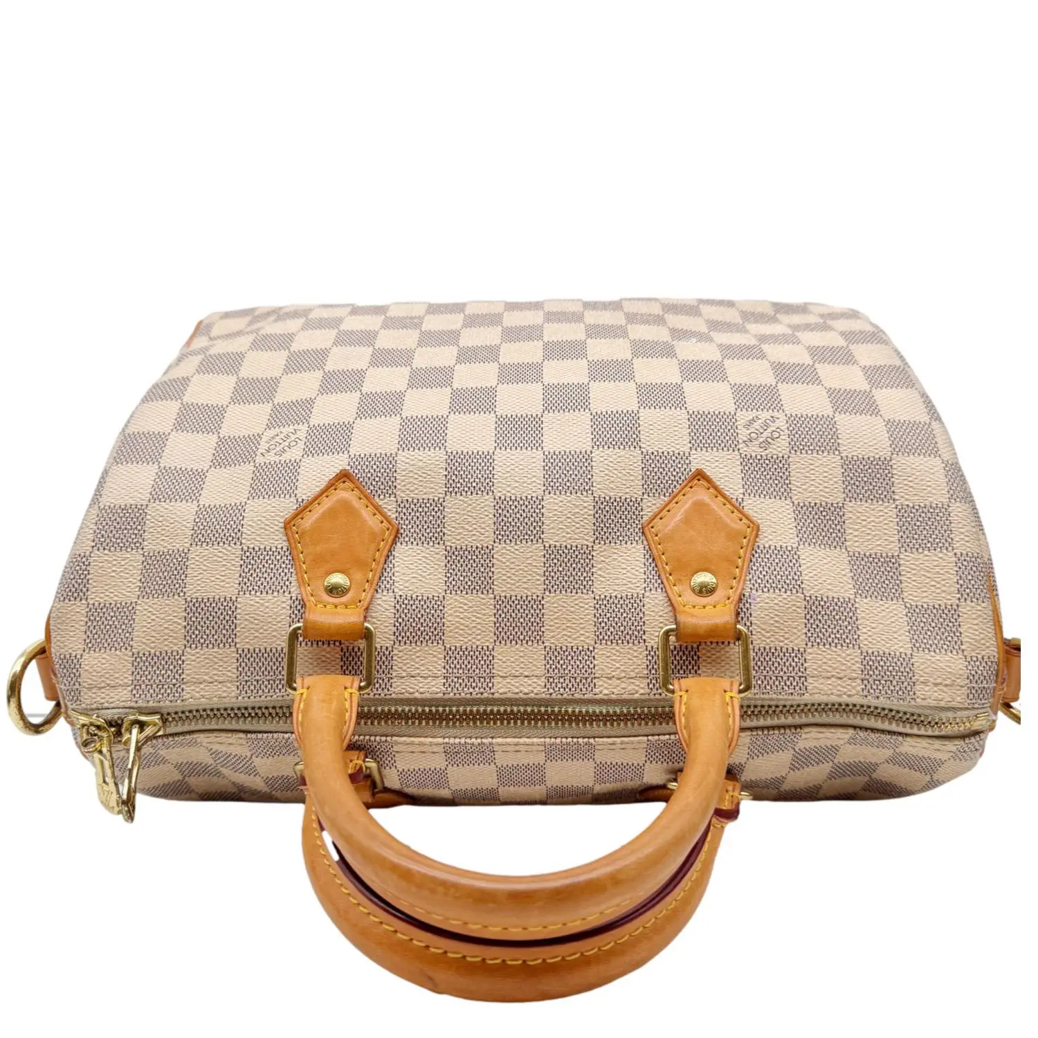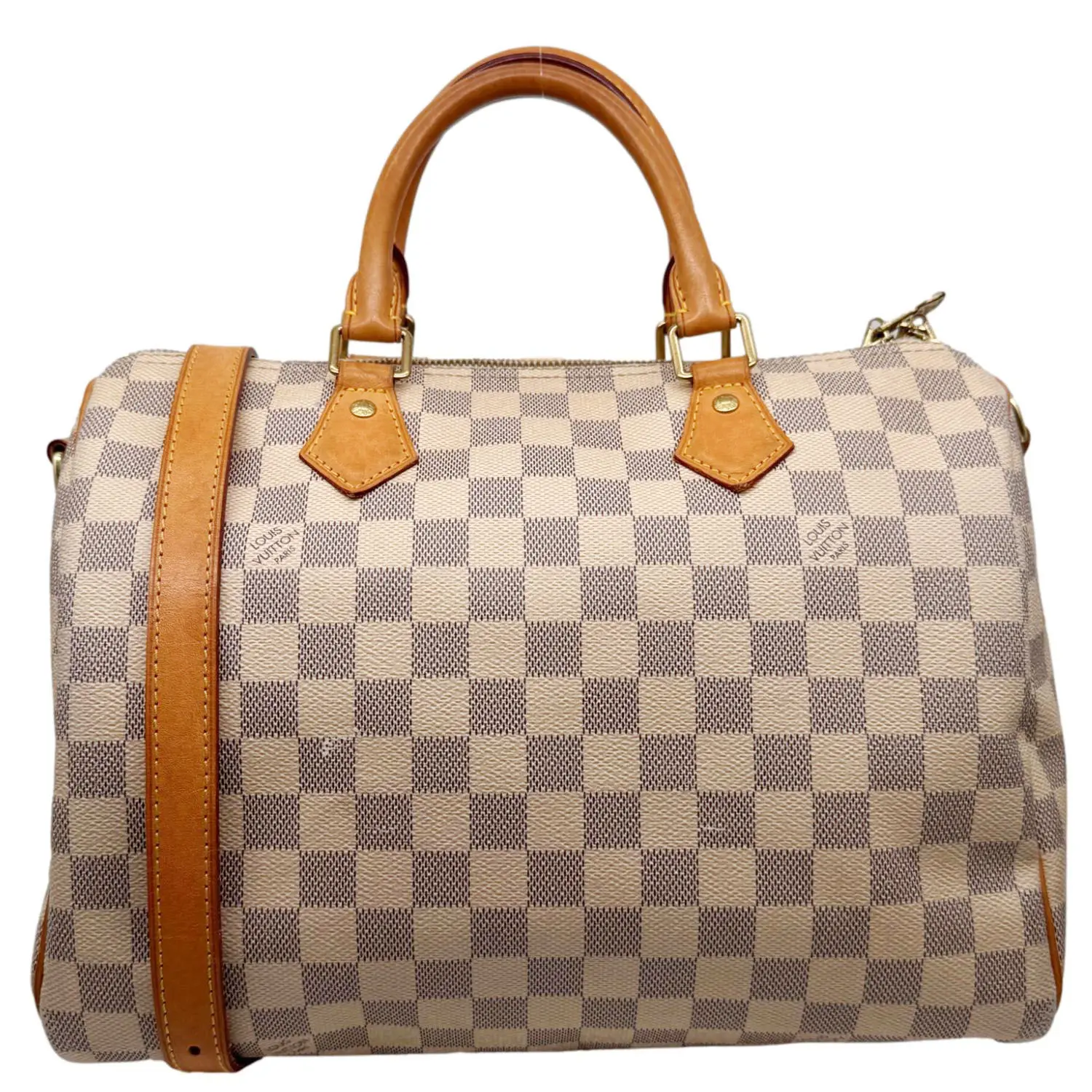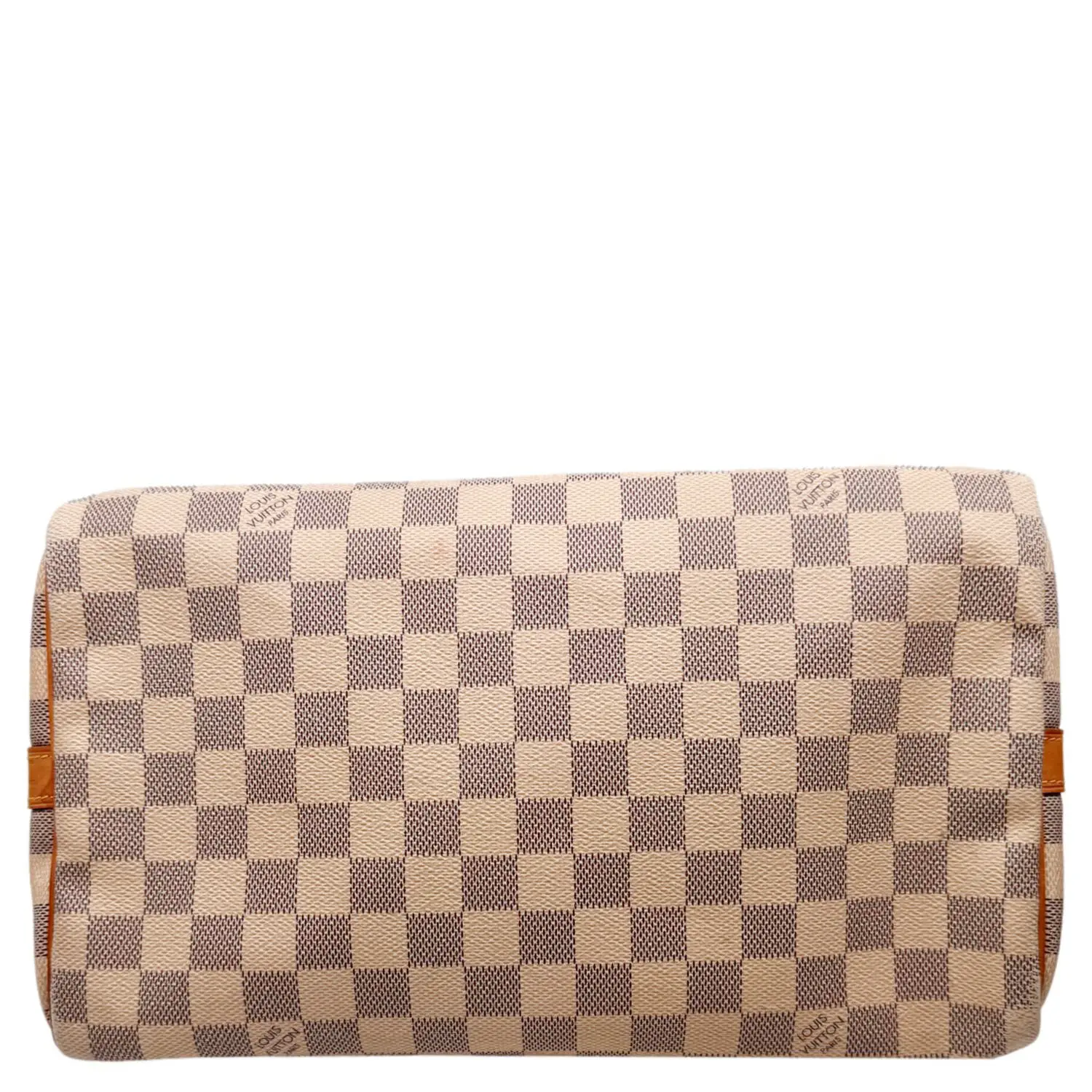 Louis Vuitton Speedy 30 shoulder bag in Damier Azur canvas features a fresh white checkered pattern with a timeless, classic shape. Spacious and lightweight, it offers top handles and ample room for everyday essentials or travel use.