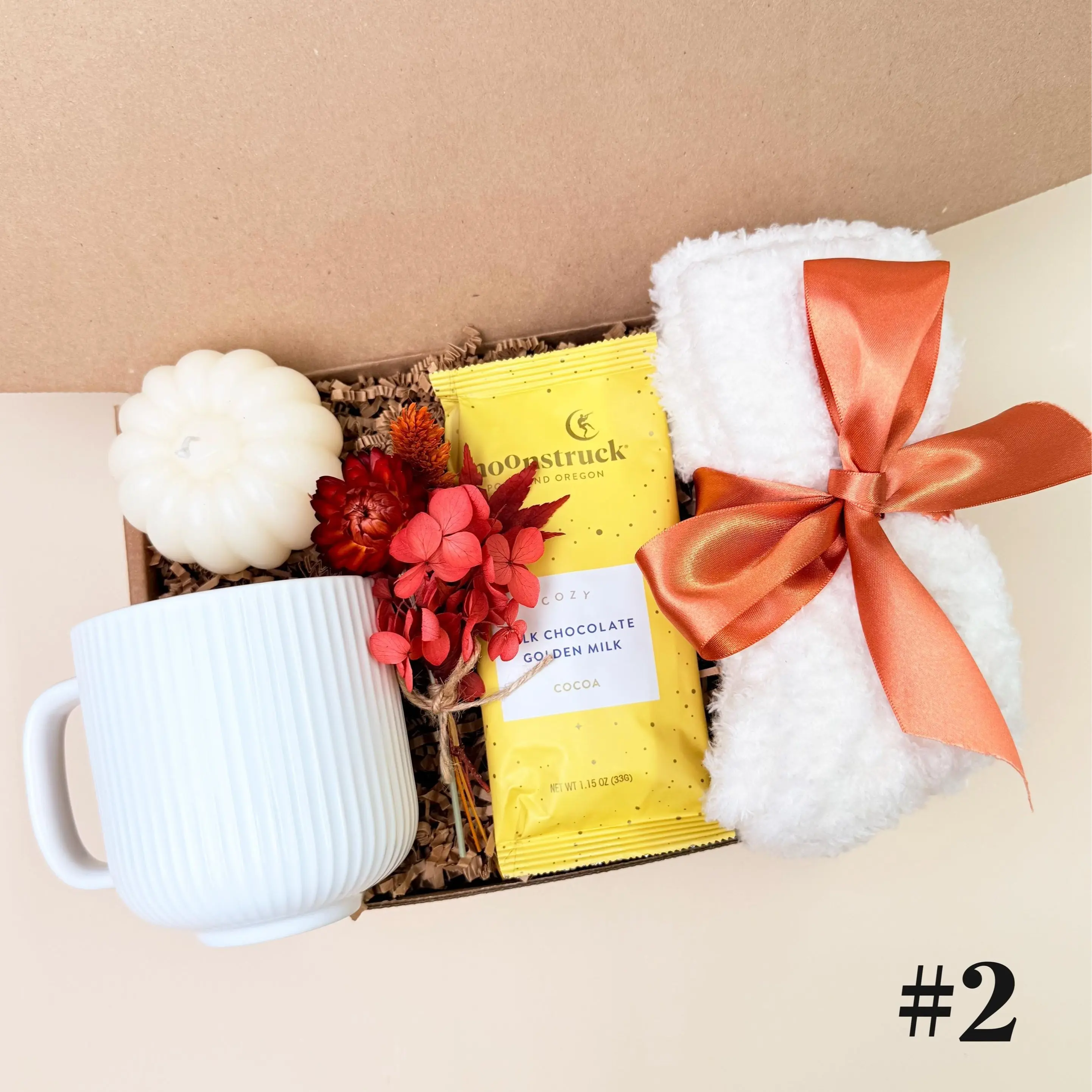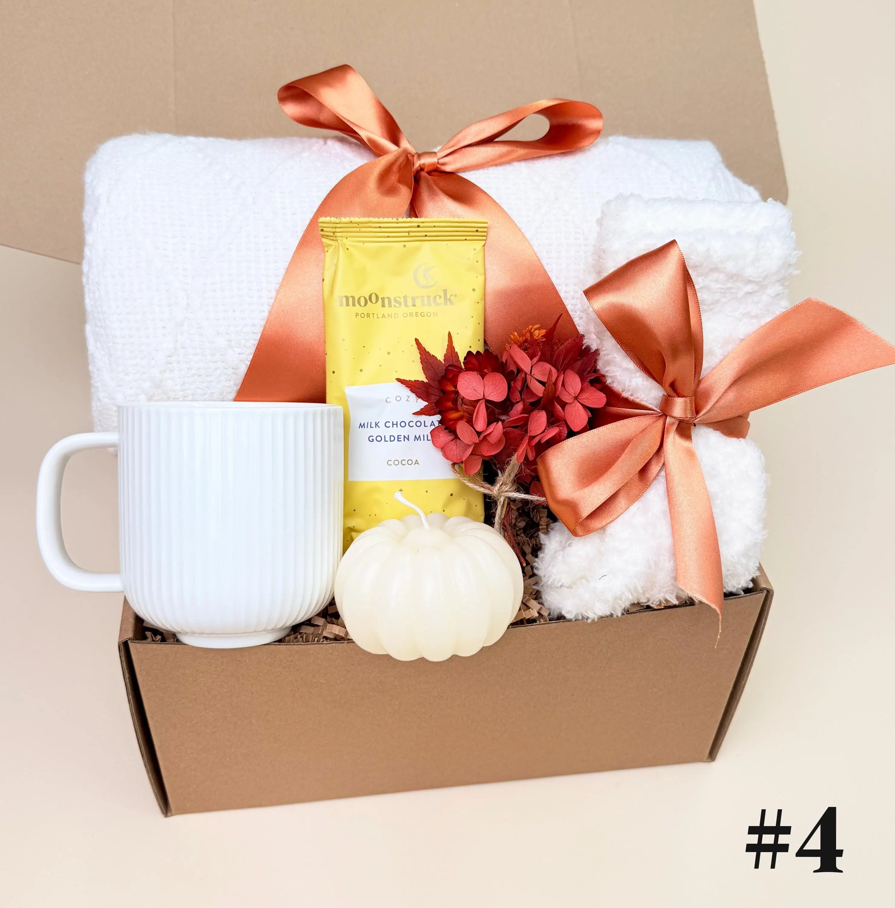 - Comes with a cozy blanket, mug, cozy socks, mini dried flowers, 1 hot cocoa packet, and pumkpin candle