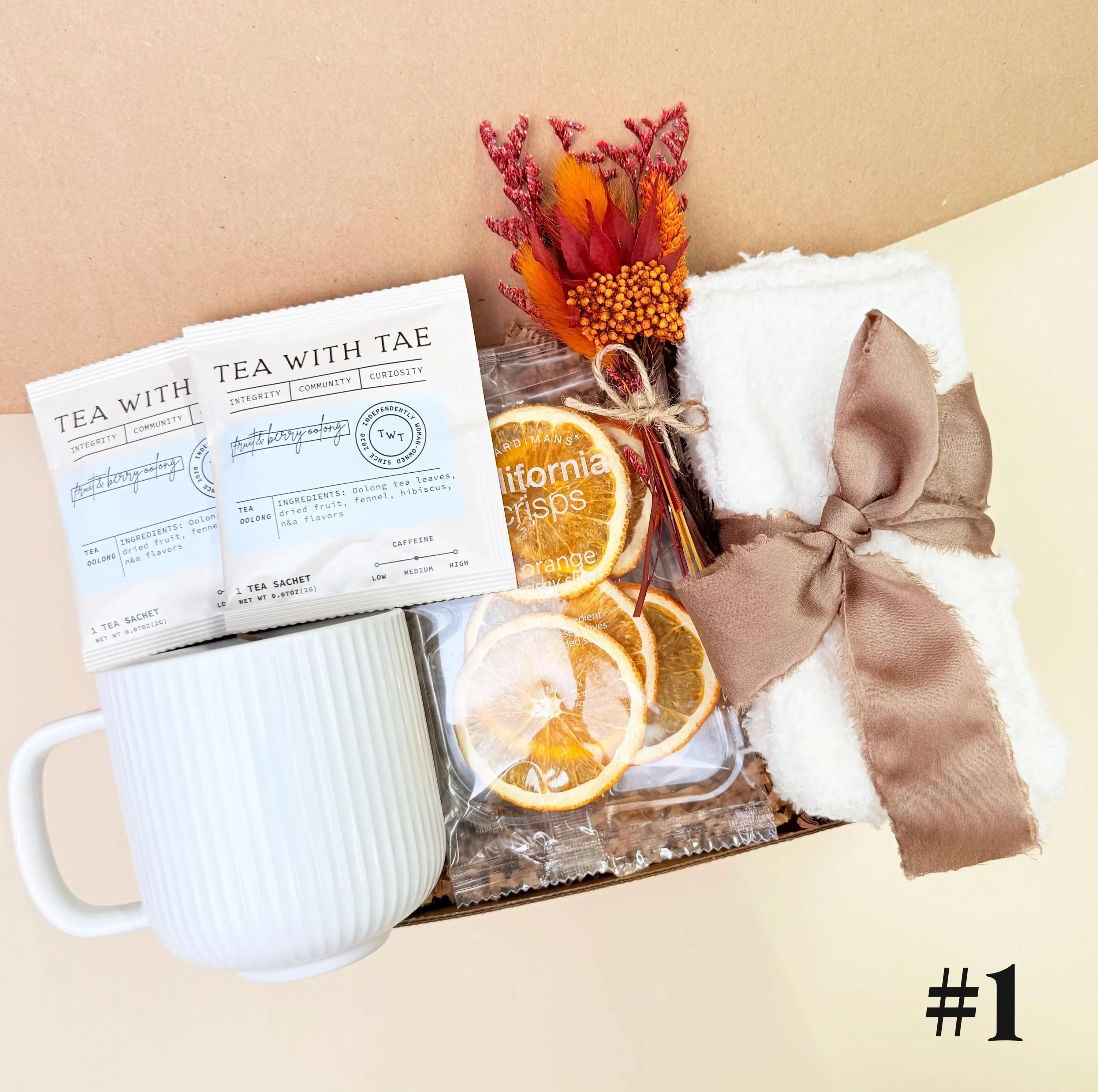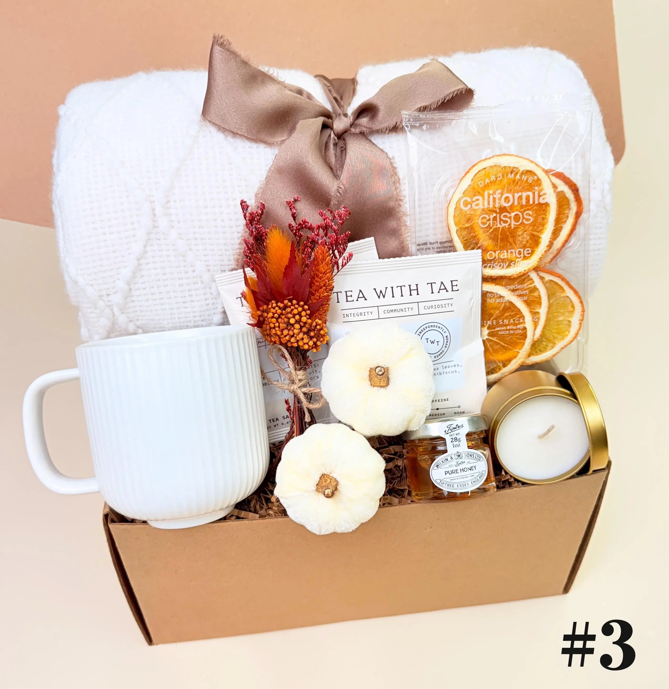 - Comes with a cozy blanket, mug, 2oz scented soy candle, 2 tea packets, mini jar of honey, crispy orange slices, mini dried flowers, and 2 fuzzy pumpkin clips