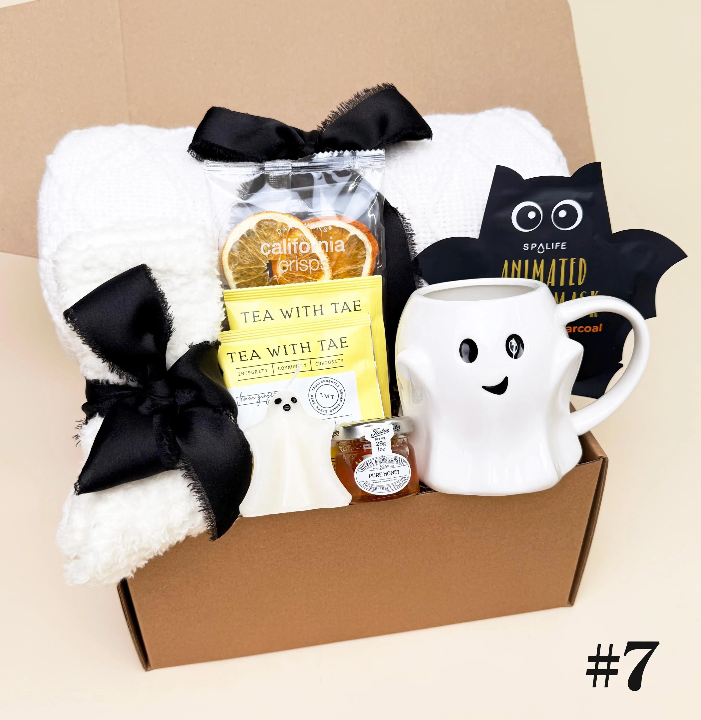 - Comes with a cozy blanket, halloween ghost mug, 2 tea packets, ghost candle, cozy socks, crispy orange slices, mini jar of honey, and halloween sheet mask