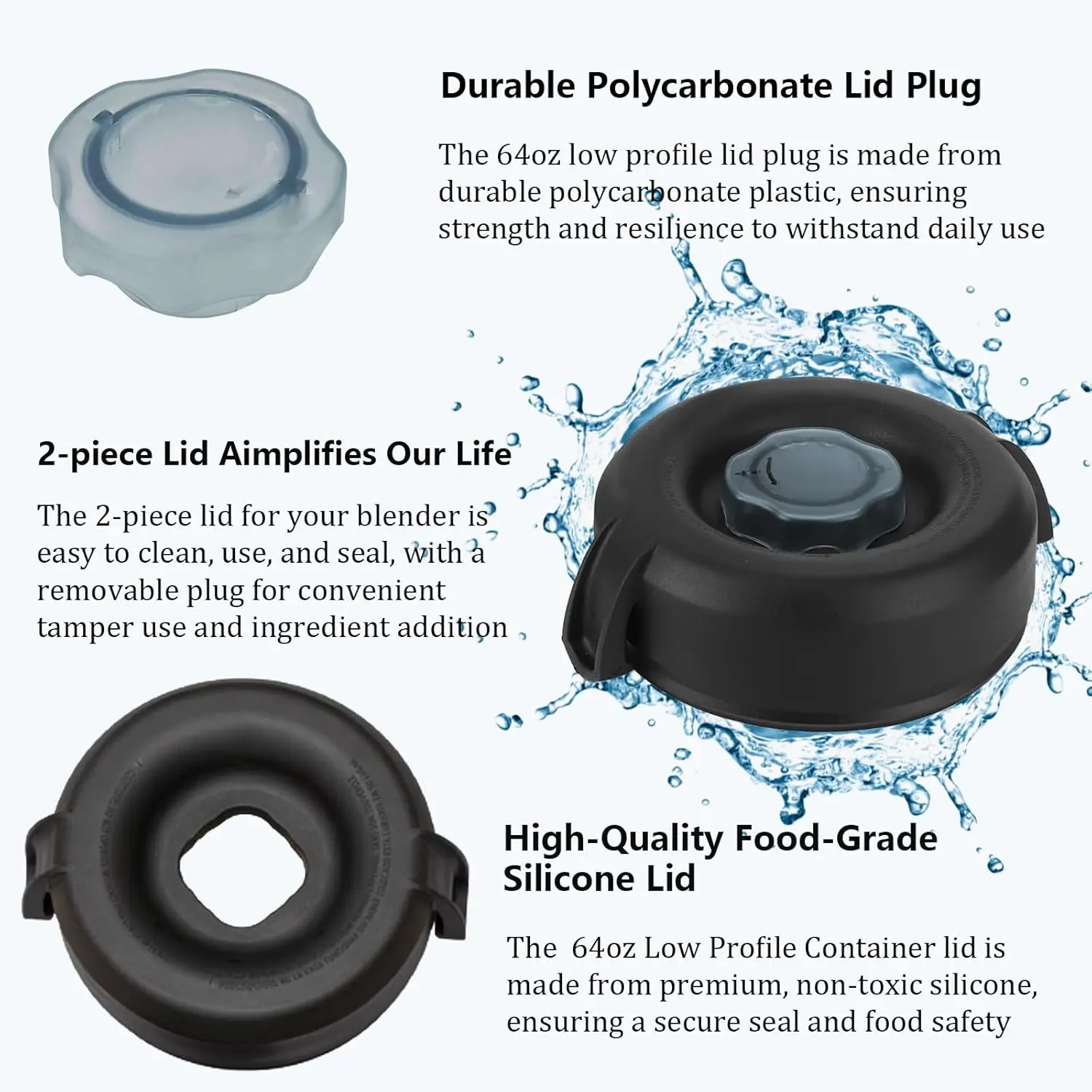 ·【WHAT'S INCLUDED】Each package includes 1 piece lid plug and 1 piece rubber lid for 64oz low profile container.High-quality replacement lid ensures optimal blender performance!(The 64-ounce low-profile container replacement lid not compatible with the 64-ounce high-profile container or other 48-ounce containers)