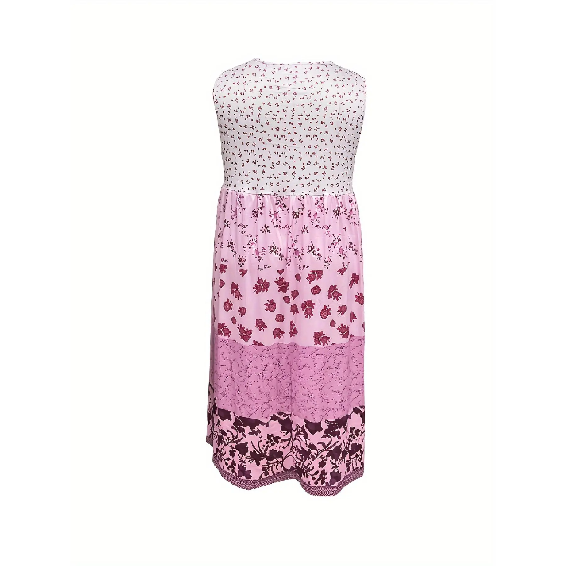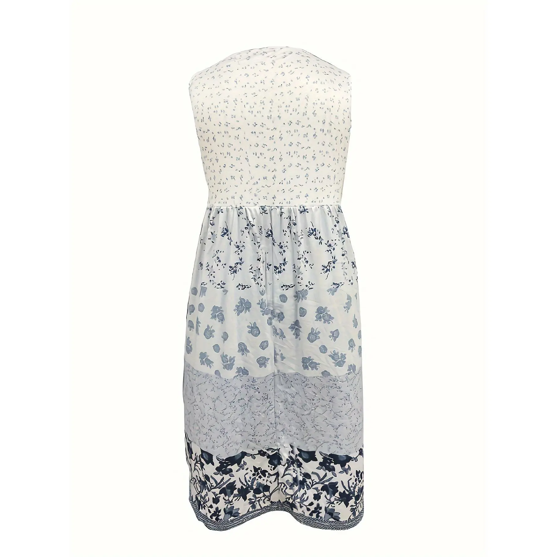 Plus Size Boho Dress, Women's Plus Colorblock Ditsy Floral Print Round Neck Smock Tank Dress