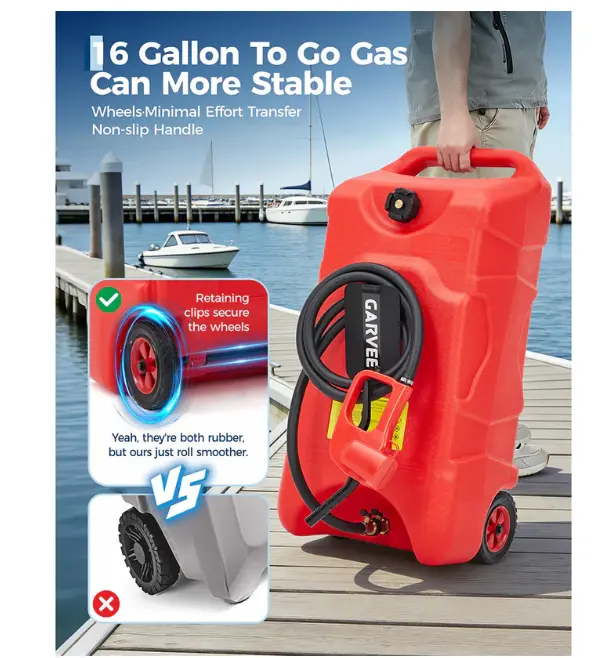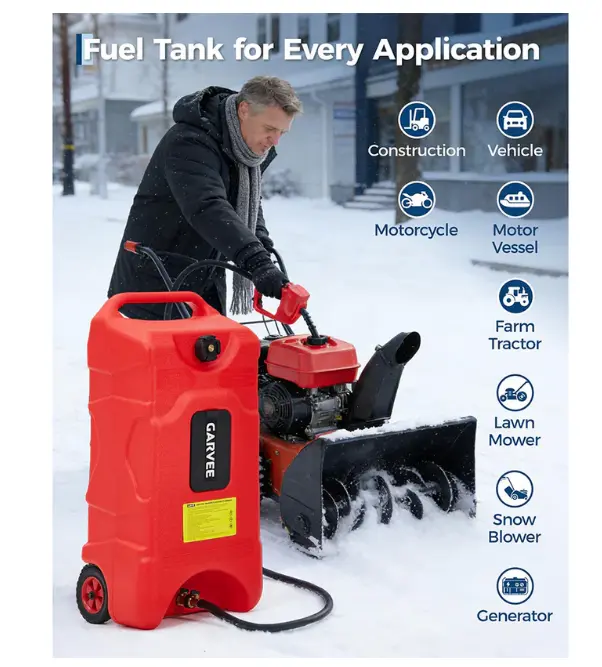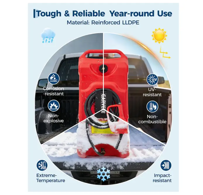 Versatile Fuel Management: Compatible with gasoline, diesel, and biodiesel. Features clear gallon/liter markers, integrated tool compartment, and stackable design—perfect for off-grid power, marine use, and equipment refueling.