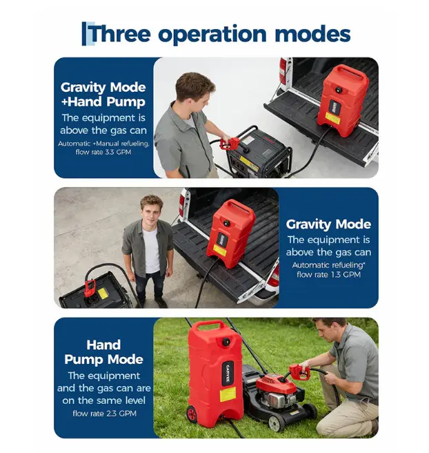 Efficient Fuel Transfer: Switch between fast gravity feed (3.3 GPM) and manual siphon pump with ergonomic T-grip. Includes 18" reinforced hose, auto-shutoff nozzle, and 360° rotating spout for easy, precise refueling. Patent-pending zero-waste drainage maximizes every drop.