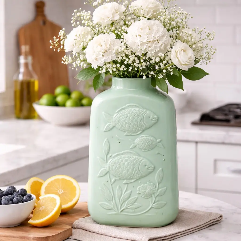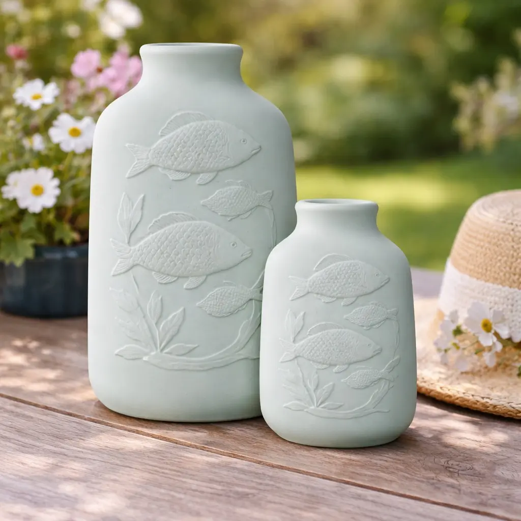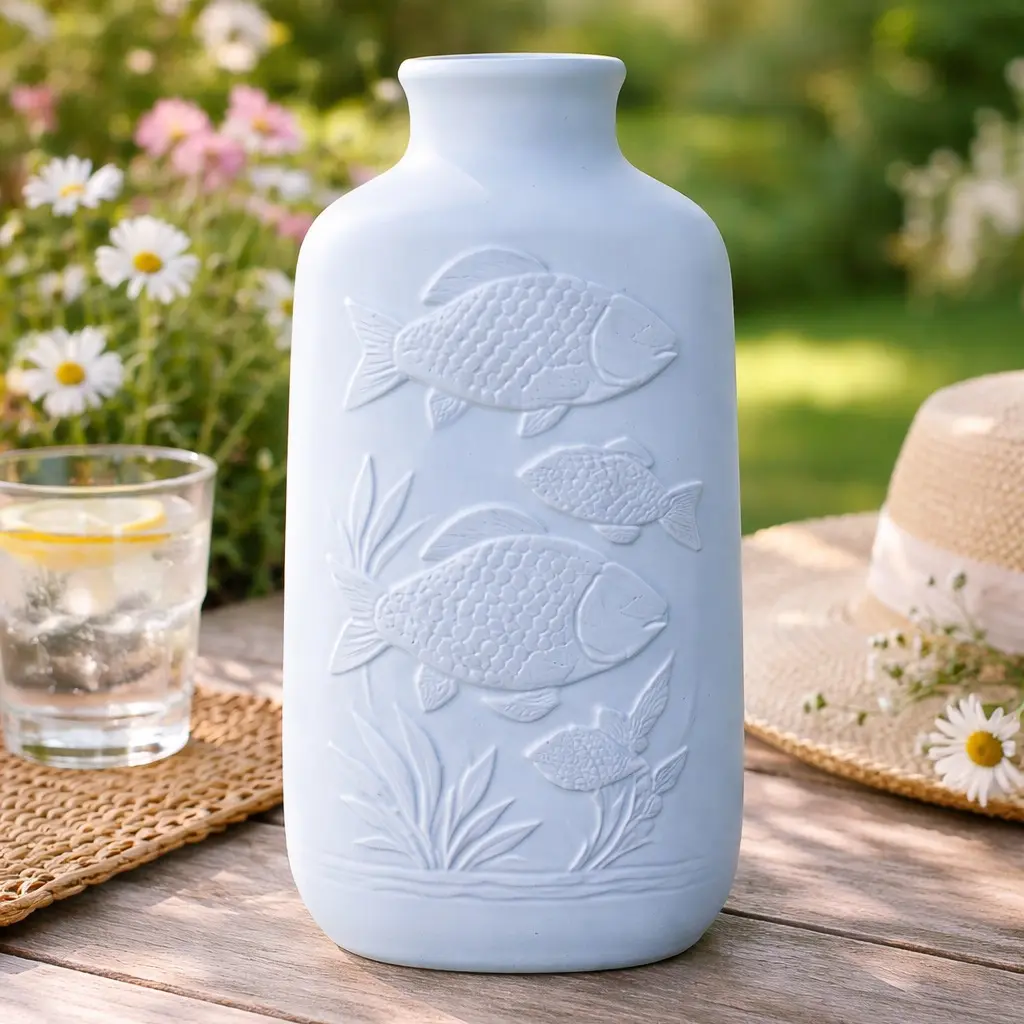 Meet the Coastal Current Vase - a beautifully sculpted piece inspired by the movement of the sea. Featuring an embossed fish pattern swimming through gentle waves and aquatic textures, this vase captures the peaceful rhythm of ocean life.