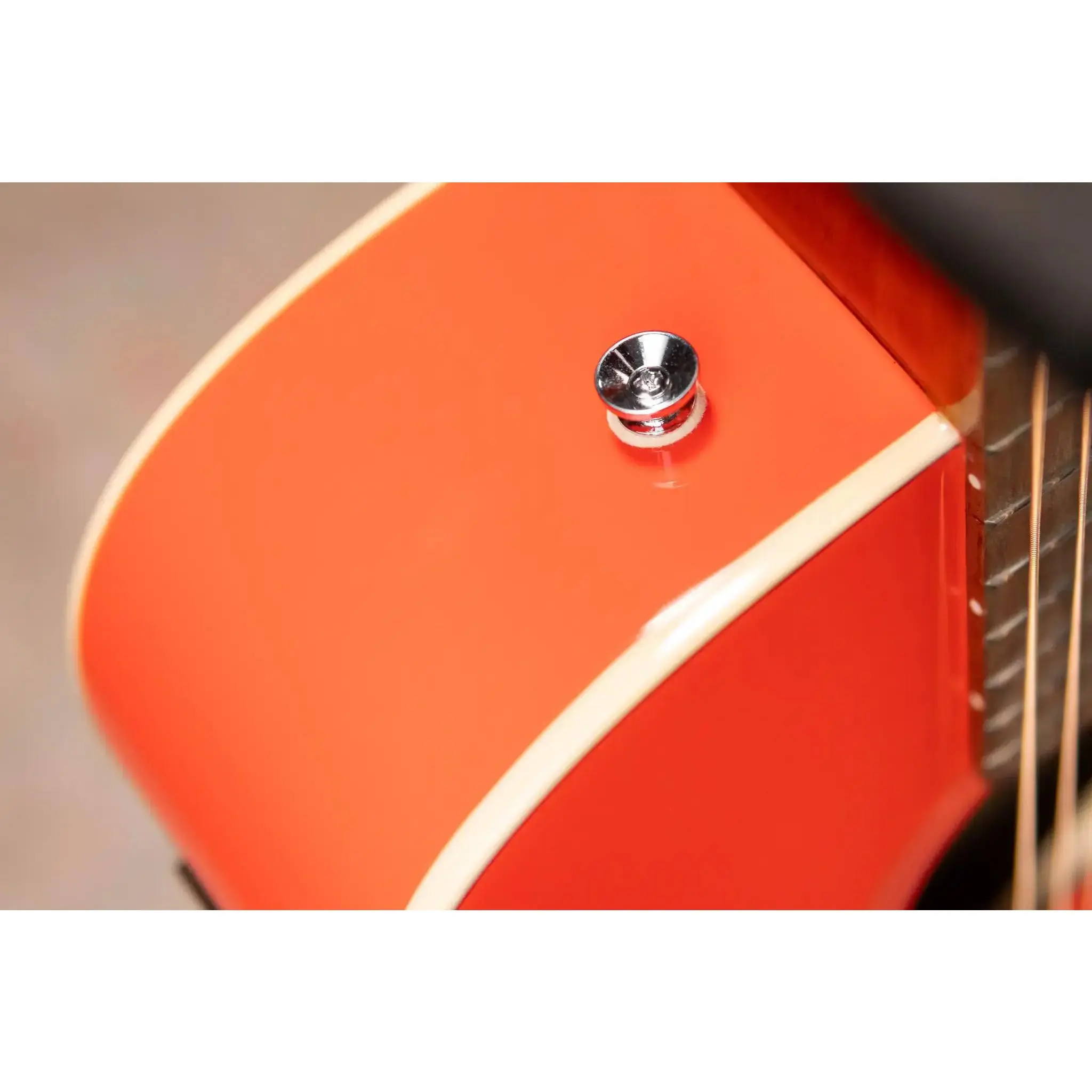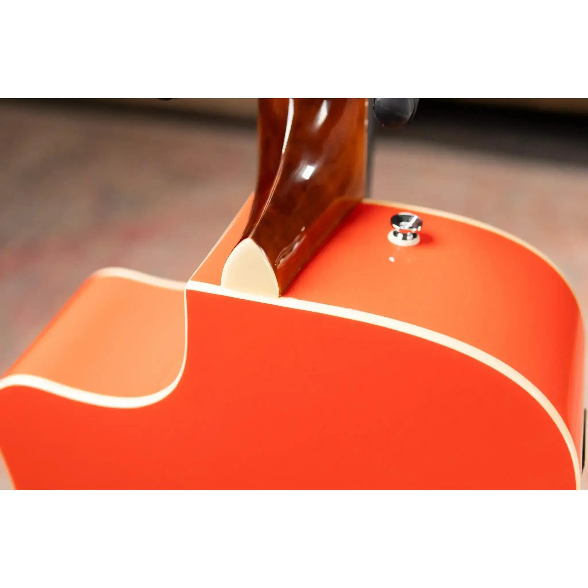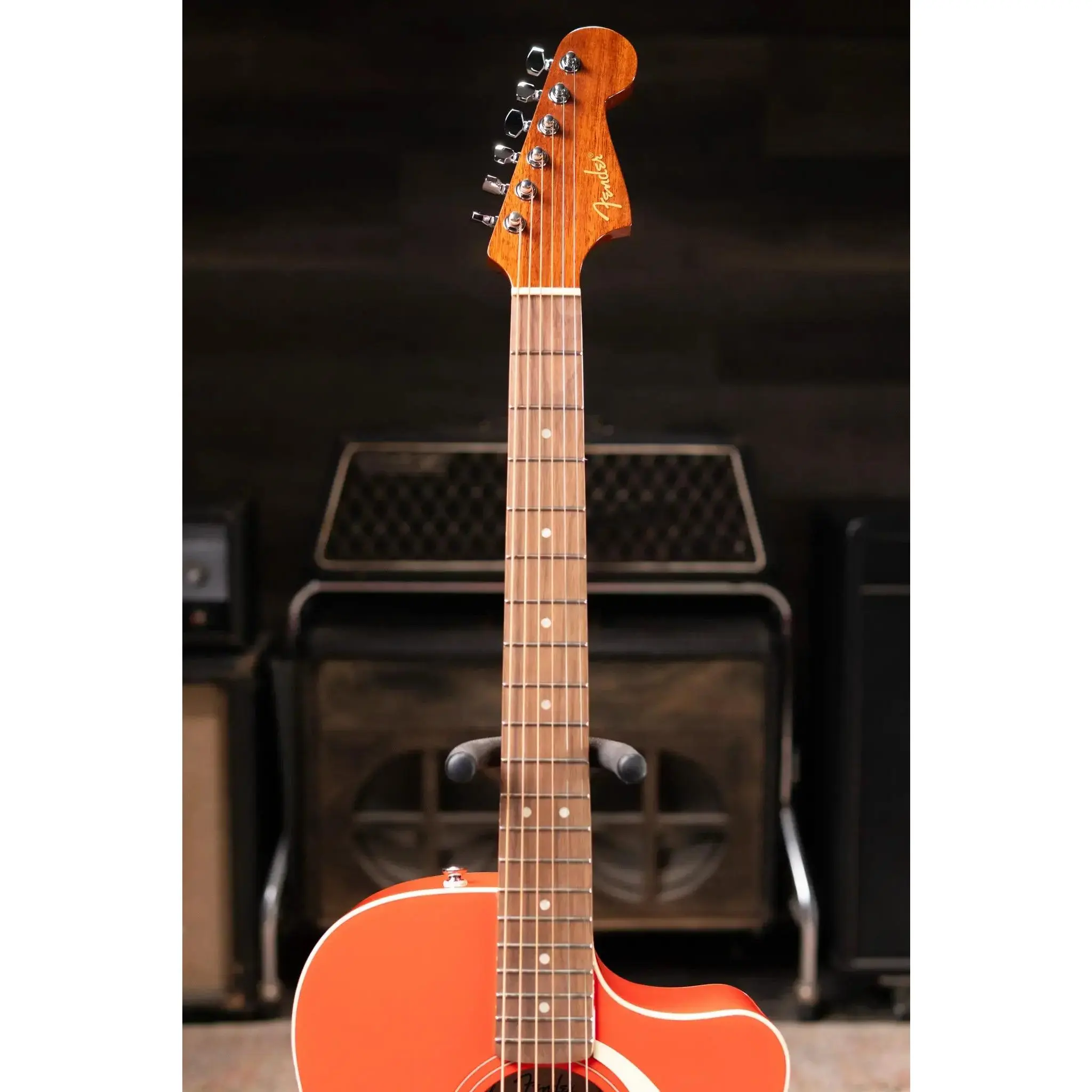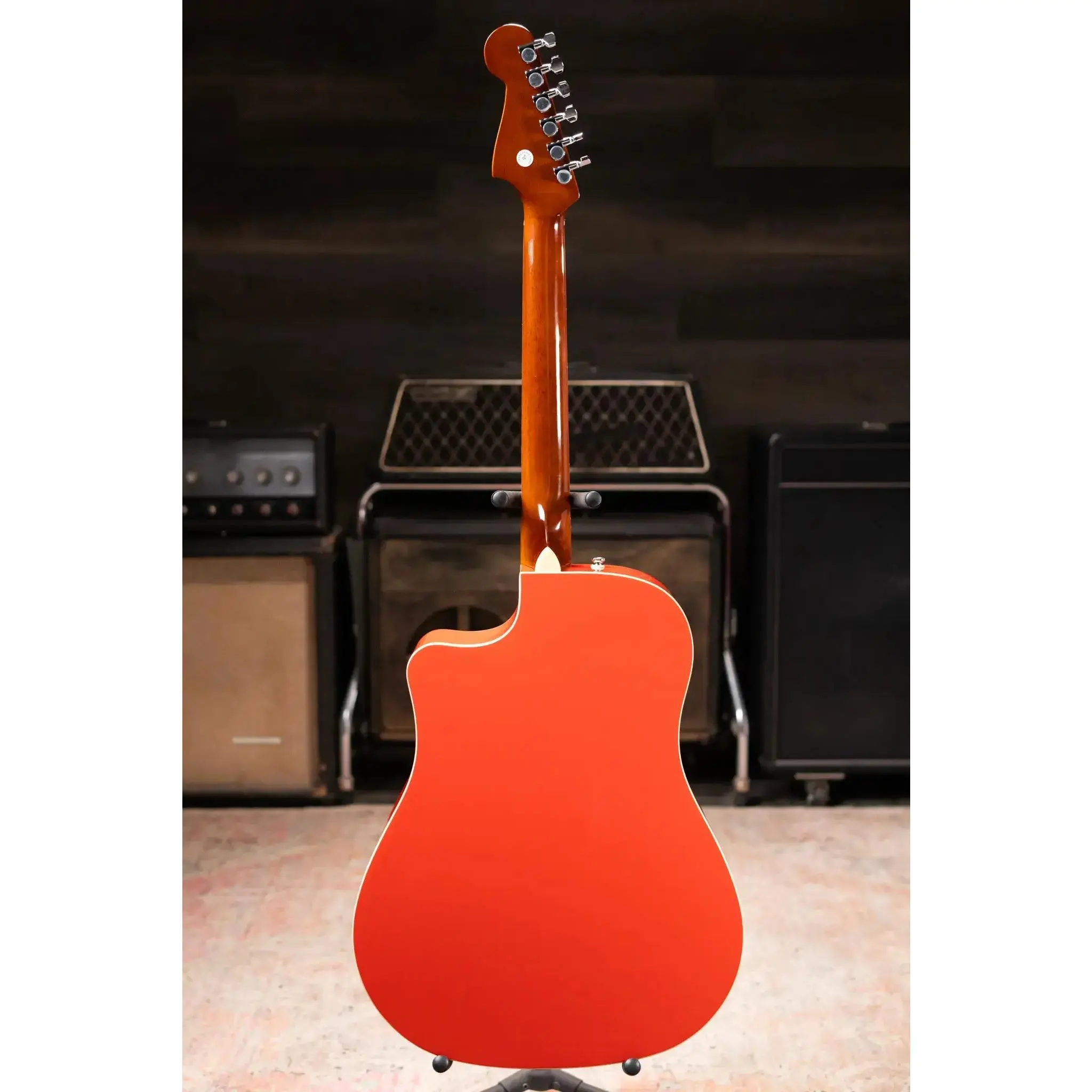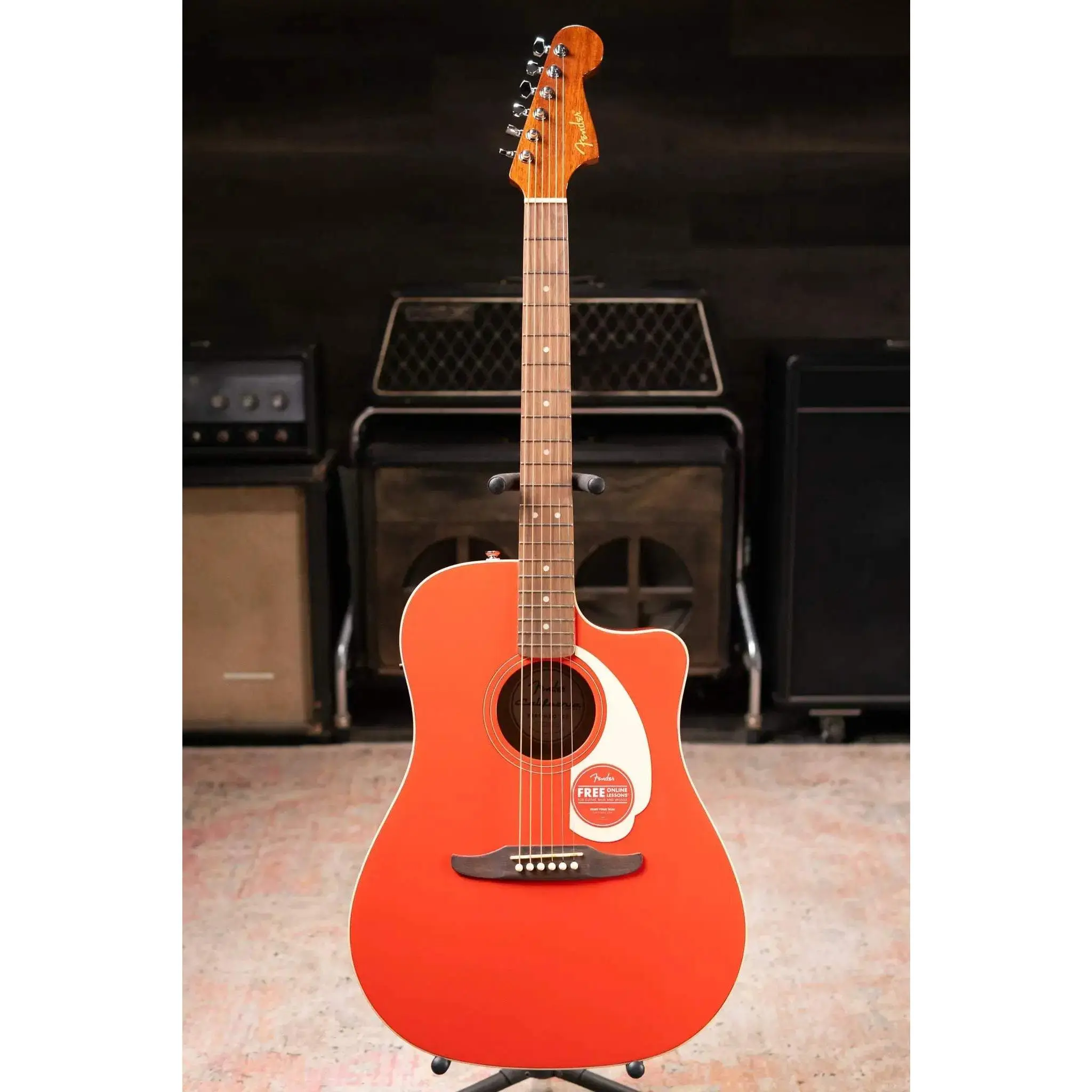 The Fender California Standard Redondo CE Fiesta Red brings classic Fender attitude to the acoustic-electric world, blending bold style with a powerful, versatile voice. Its dreadnought body with cutaway delivers deep lows and strong projection, while the spruce top paired with sapele back and sides offers a balanced, satisfying tone that works equally well for strumming, flatpicking, or solo playing.