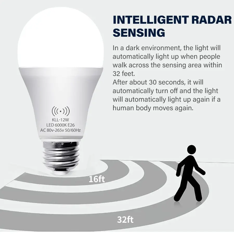 Kasotile Motion Sensor LED Bulb, 12w Equivalent 100w, 3000k/6000k, E26/e27 Base, Indoor Lighting, 80-265v, Energy Efficient