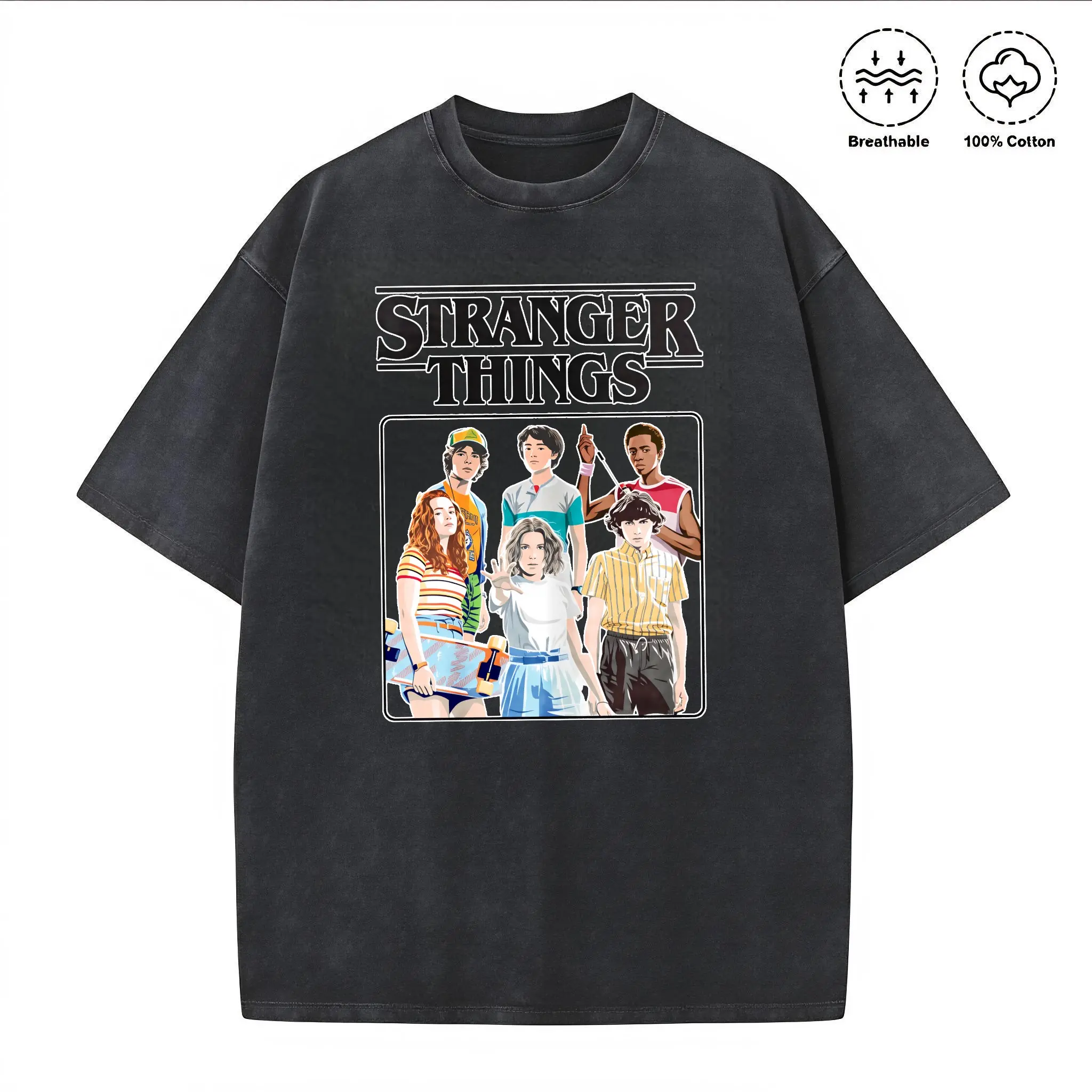 5. Washed T-shirt made of 100% cotton with double-sided printing Stranger Things Vintage Eighties Retro Group Shot Title Logo T-Shirt