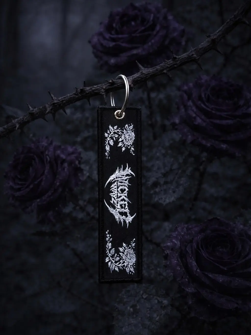 This double-sided woven key tag features the Wicked Wayz insignia on one side—surrounded by flourishing roses in full bloom, symbolizing life, growth, and ascension. Flip it over, and the mantra “Rise Above the Damned” is framed by decaying, withering flowers, representing death, struggle, and what must be overcome.