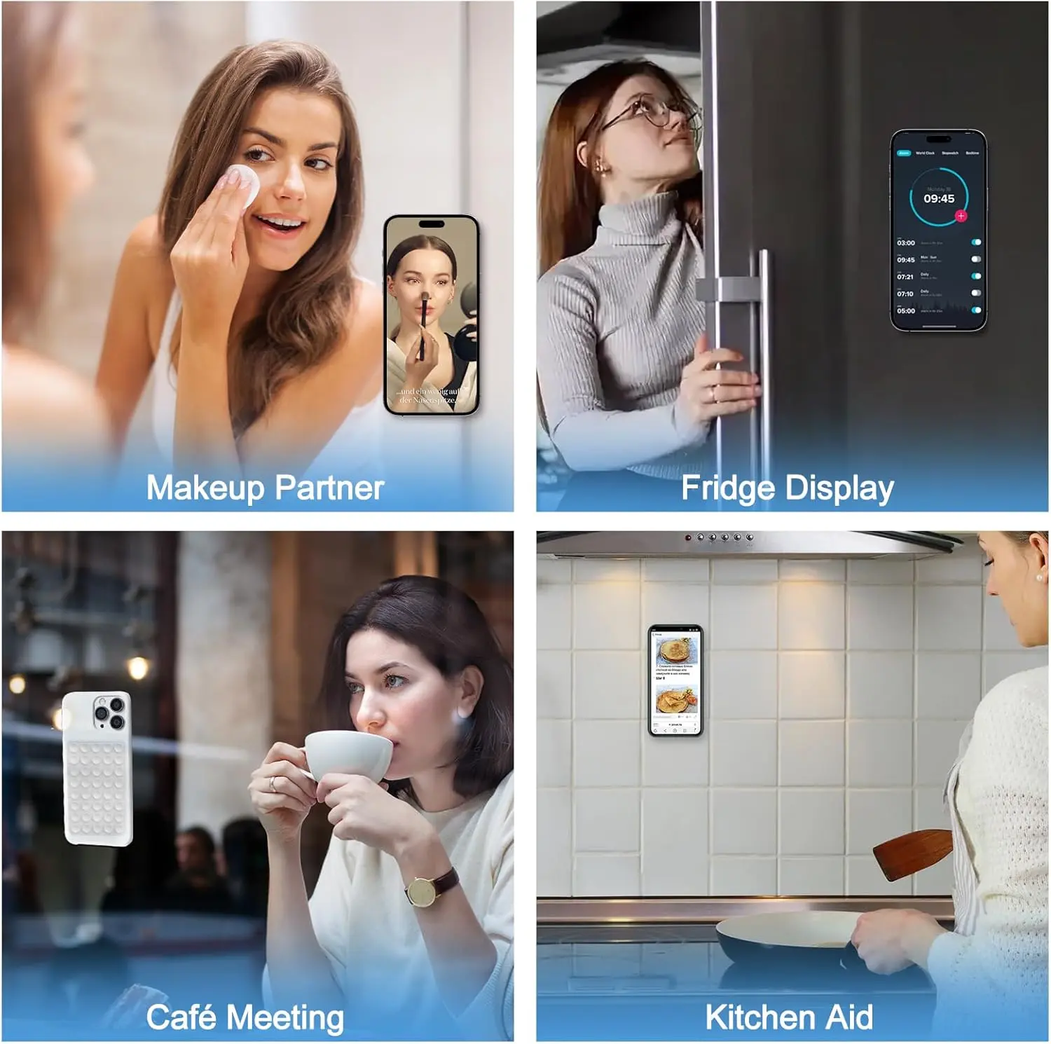 ·【Versatile Application】Our non-slip silicone pad sticky grip mount attaches to almost any Flat phone case and make it compatible with common mobile phones such as iPhone and Android.You can shoot, watch videos or video calls in the kitchen, gym, dance studio, bathroom and other places.You can even use the suction cup phone mount as a stress relief toy to relieve stress and anxiety